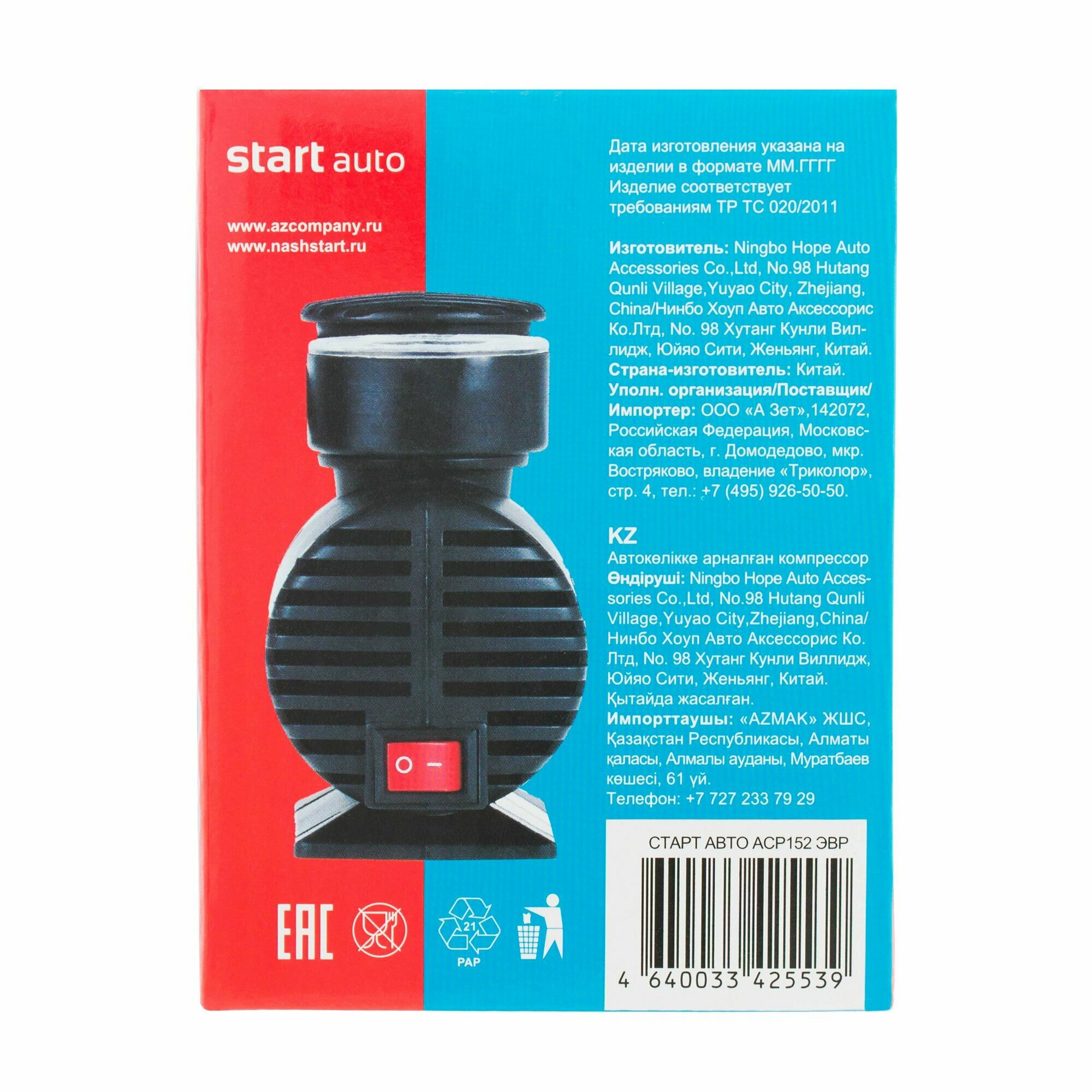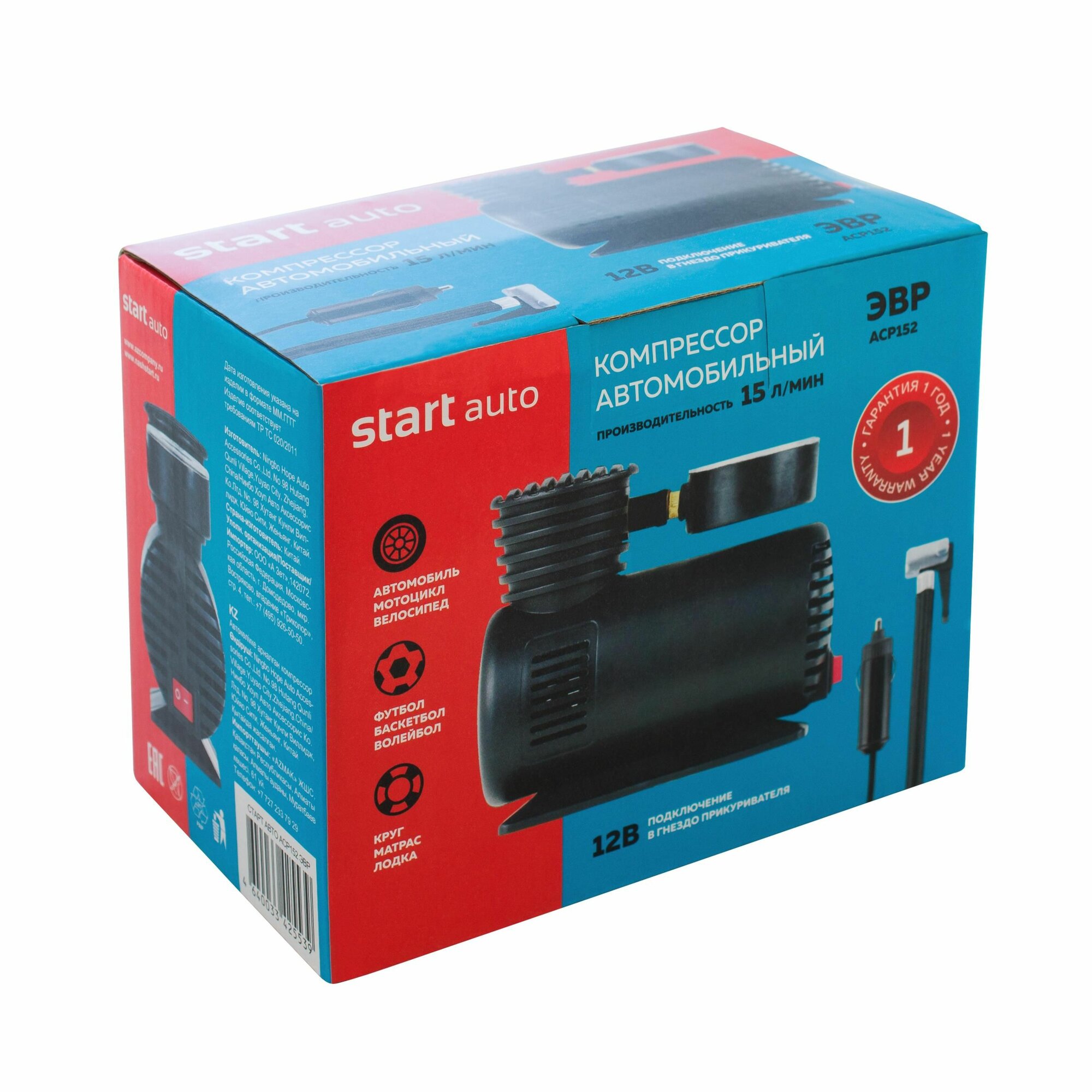 Компрессор автомобильный СТАРТ, 15л/мин, манометр, дополнительные насадки интересное: