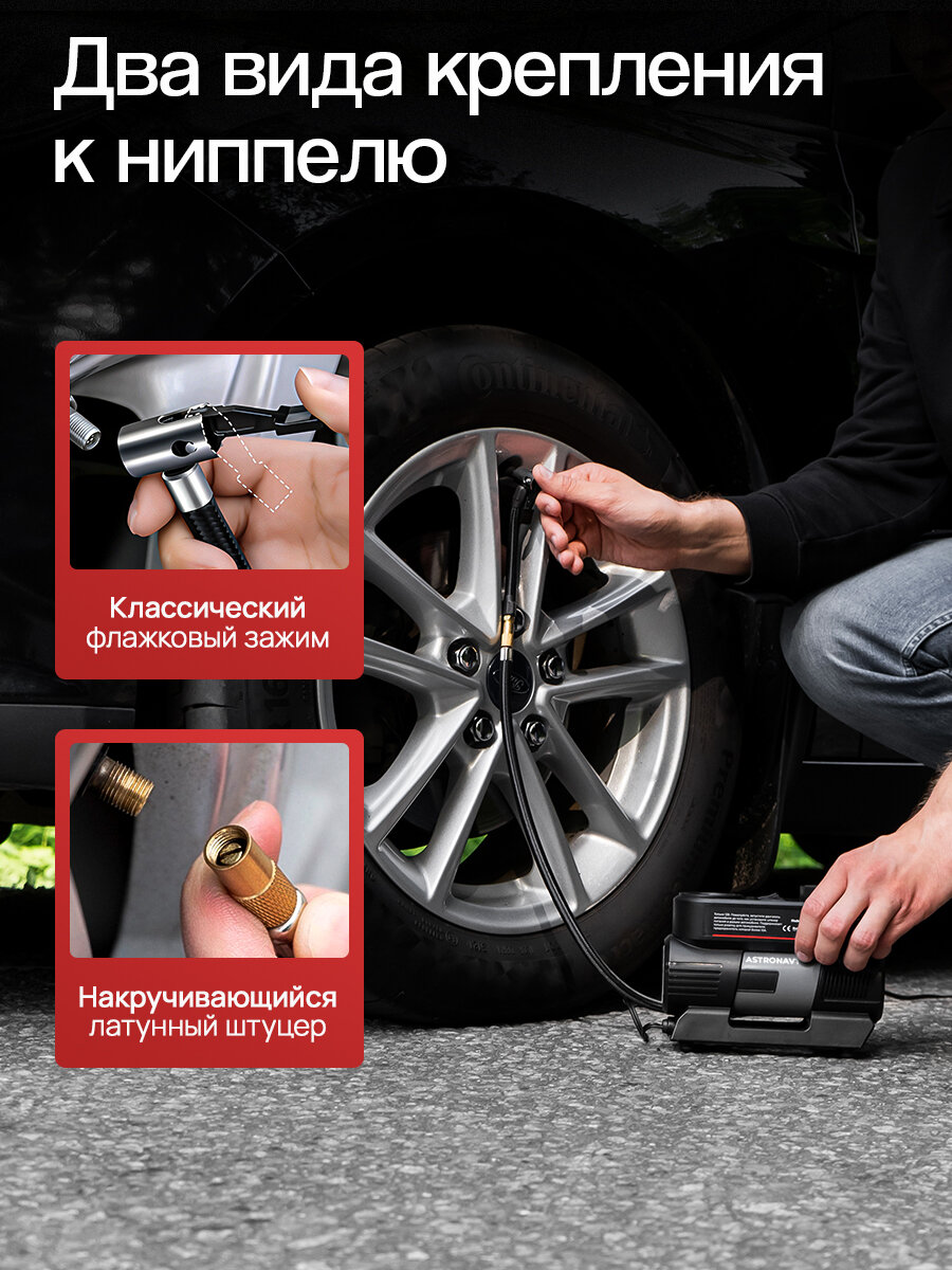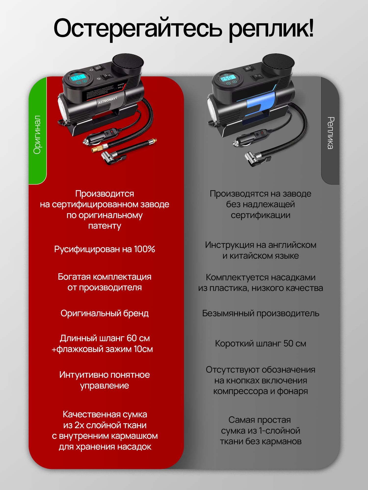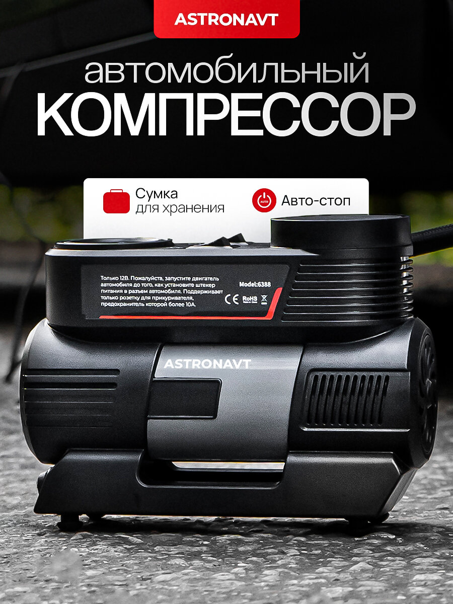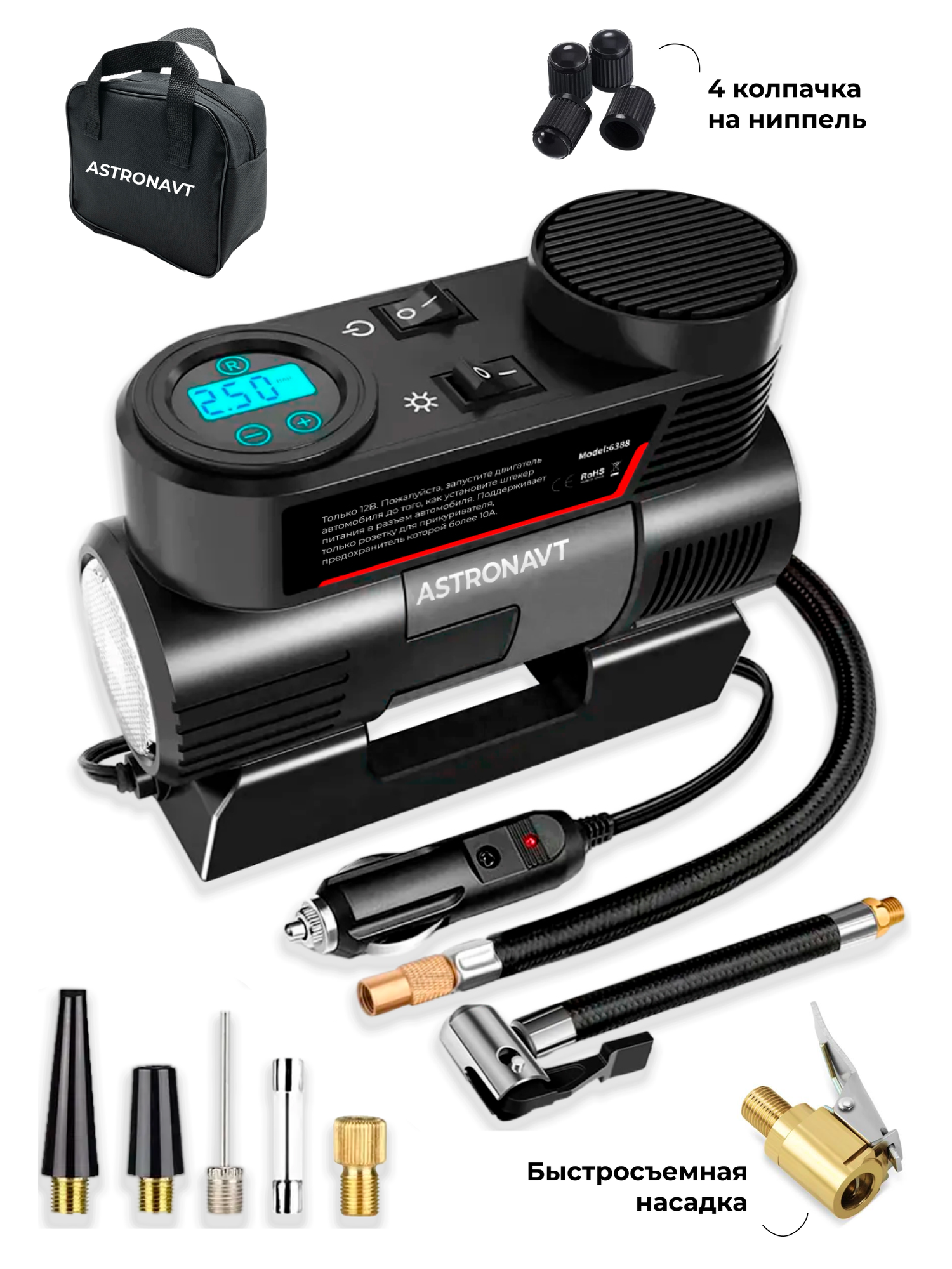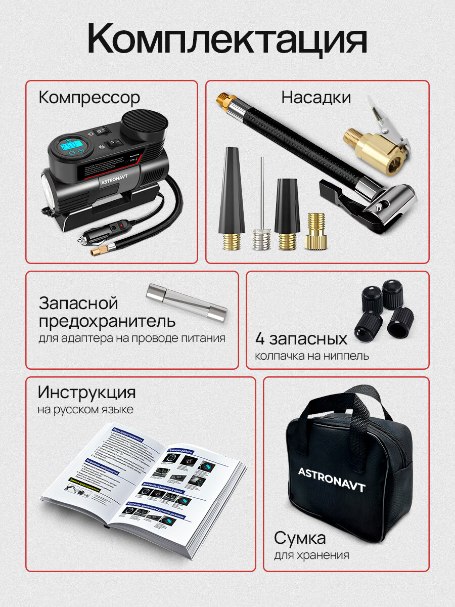 | Подробная комплектация | компрессор автомобильный; дополнительный шланг; насадки; сумка для хранения; инструкция на русском языке |