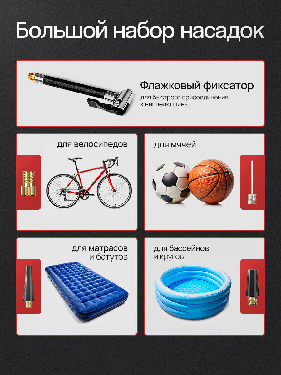 | В наборе | комплект насадок / переходник для велосипедных шин / переходник для лодок / переходник для матрасов / переходник для мячей / сумка для хранения / фонарь |