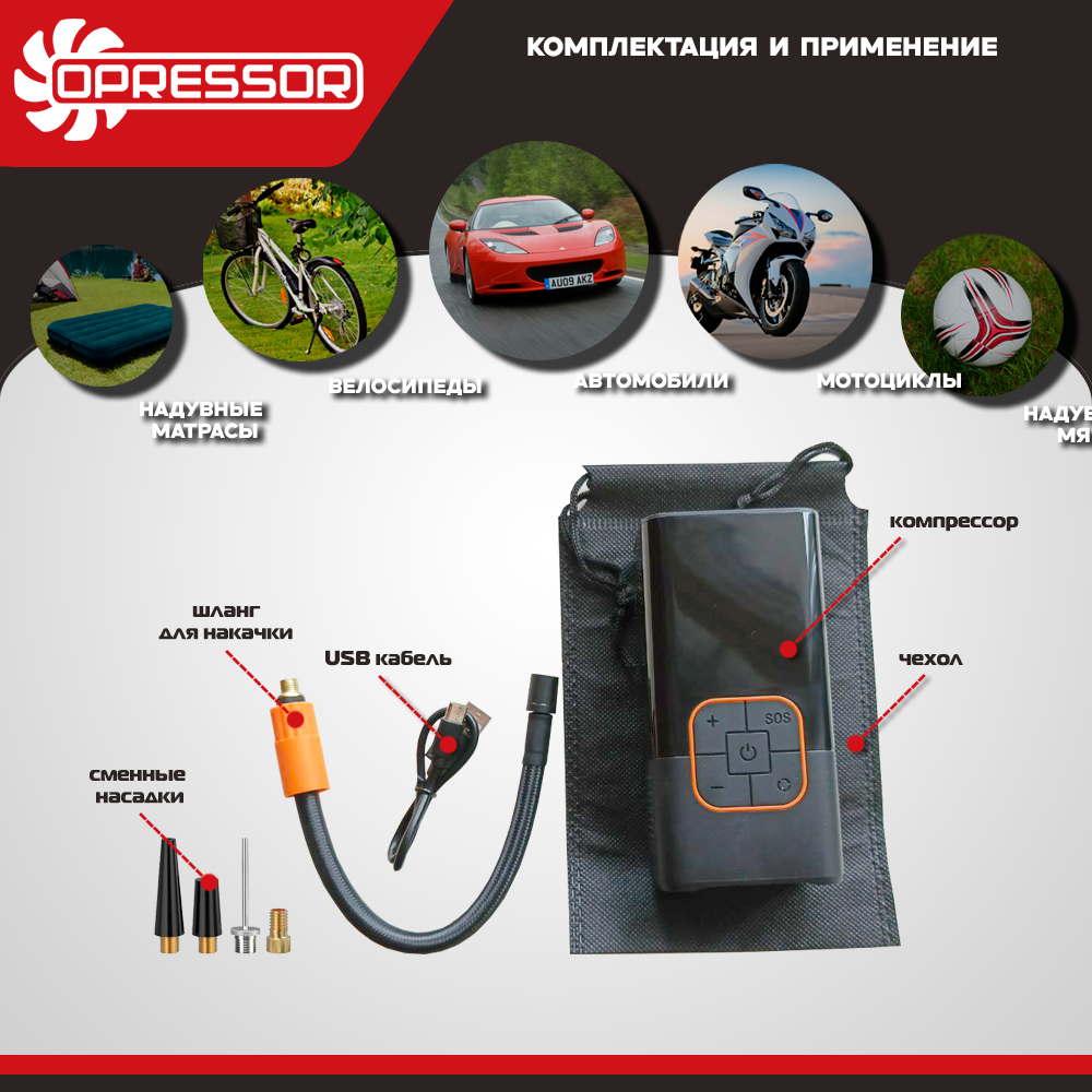 | Подробная комплектация | -Компрессор -Шланг для накачки -Чехол для хранения -Зарядный USB кабель -4 сменные насадки -Инструкция по эксплуатации -Сертификат |