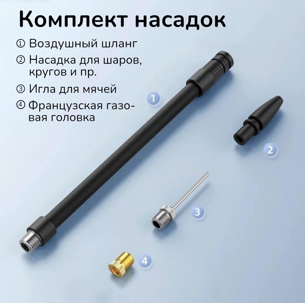 | В наборе | комплект насадок / переходник для велосипедных шин / переходник для матрасов / переходник для мячей / фонарь |
