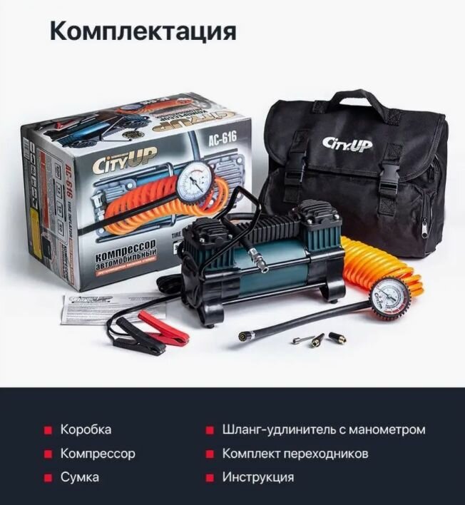 Компрессор автомобильный CityUP двухпоршневой с фонарем, 60л/мин, 300 Ватт, сумка в комплекте + переходник для АКБ