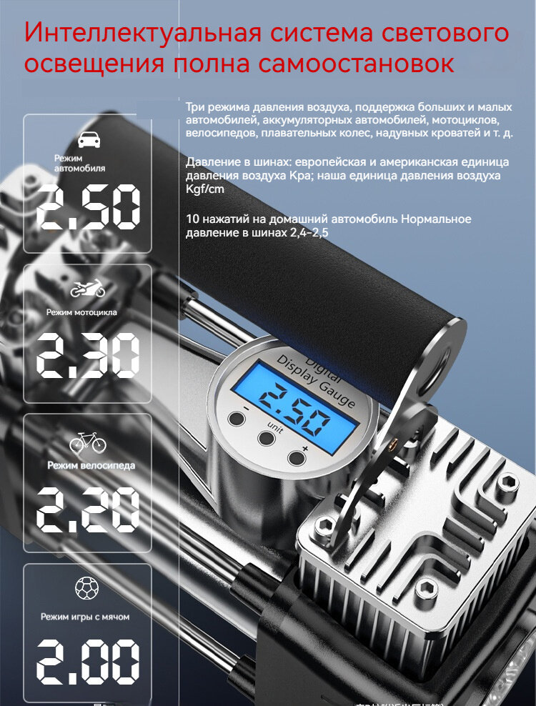 Компрессор для автомобильных шин, с двойным цилиндром, с цифровым манометром интересное:
