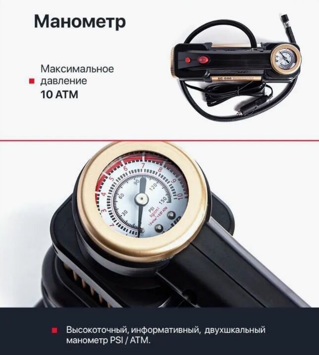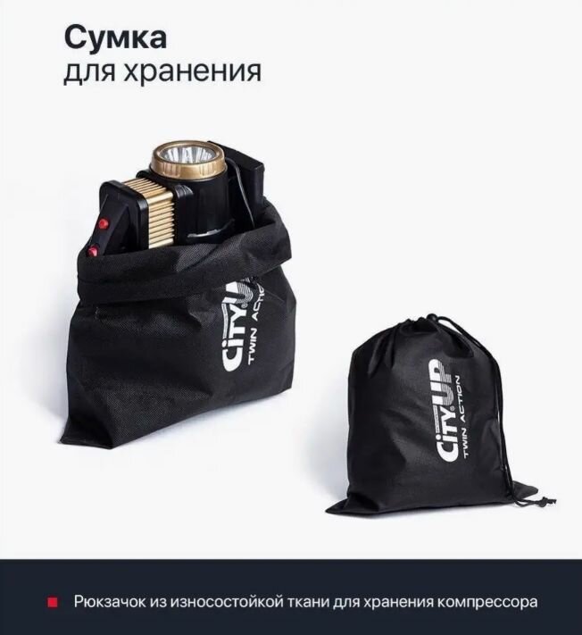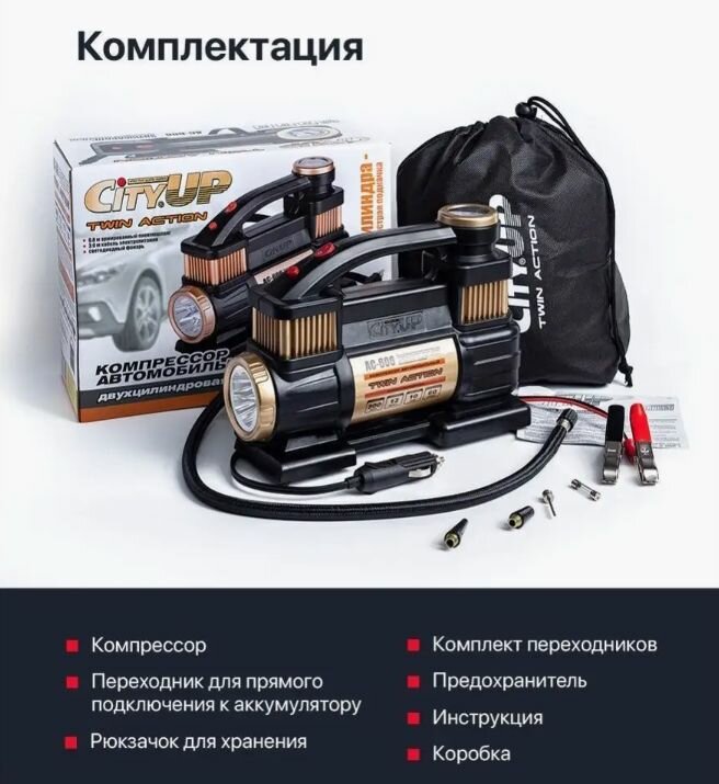 Компрессор автомобильный CityUP двухпоршневой с фонарем, 60л/мин, 300 Ватт, сумка в комплекте + переходник для АКБ интересное: