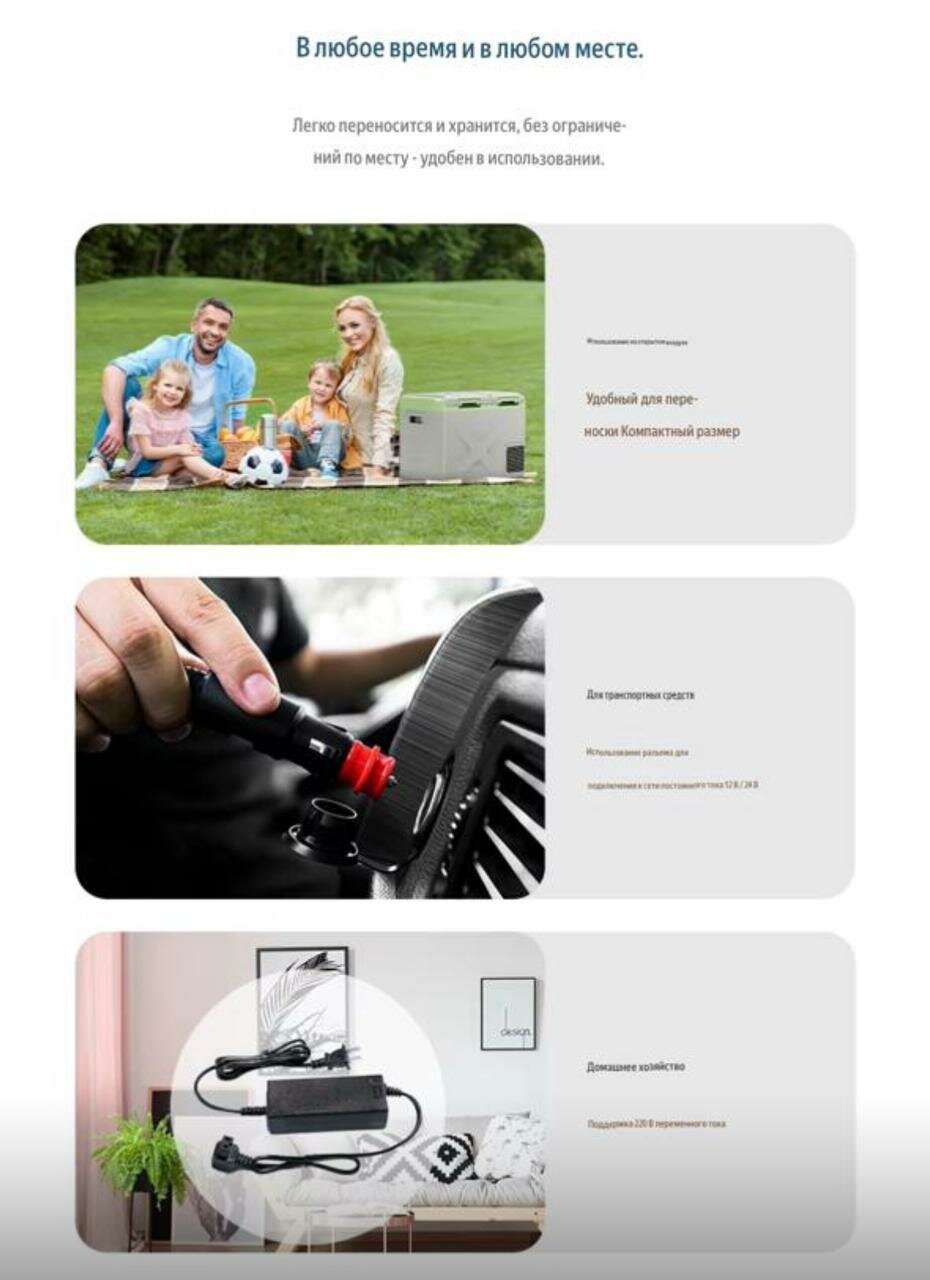 | Подробная комплектация | Автохолодильник; кабель питания 12/24 и 220в |