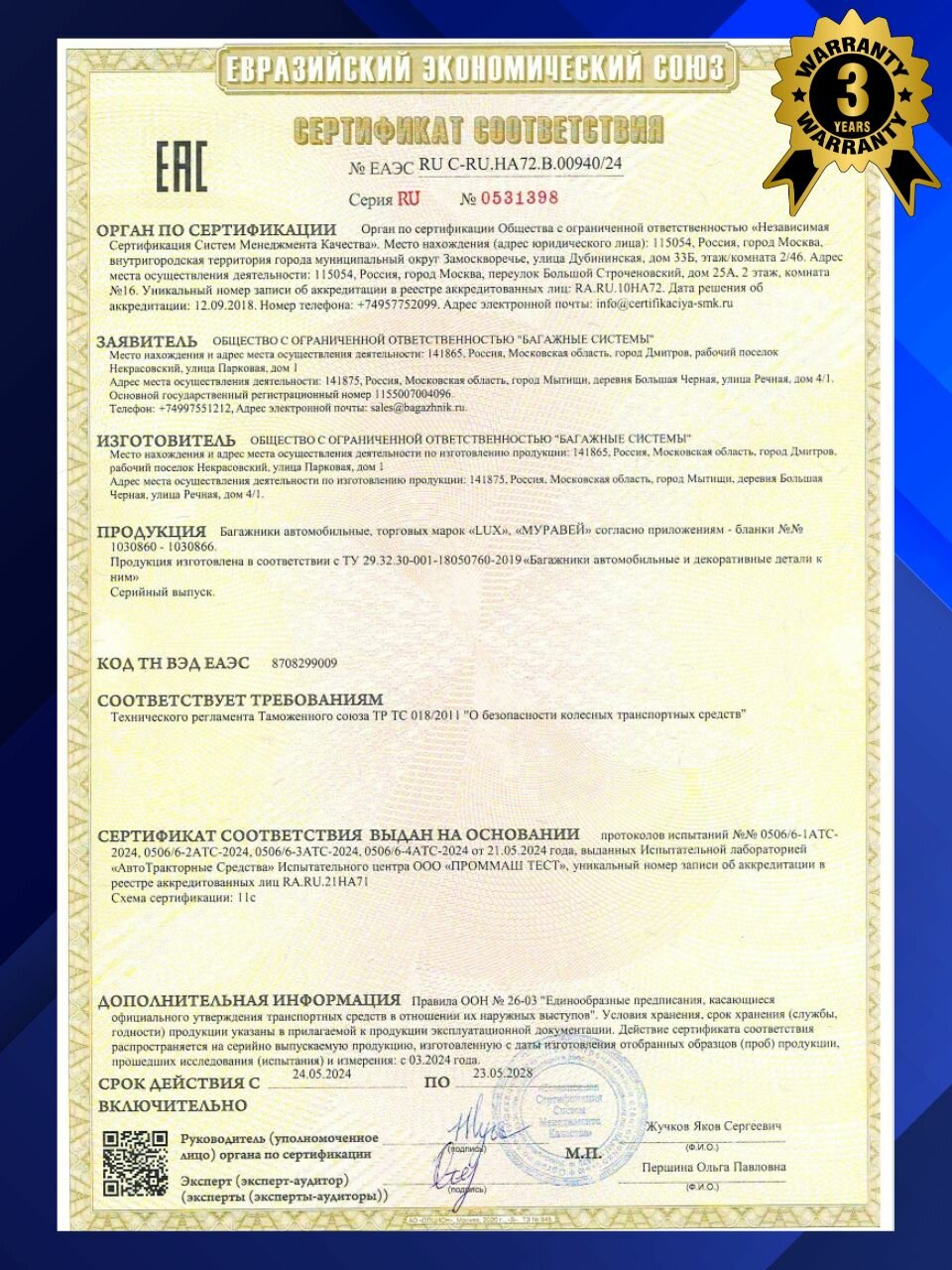 | Место крепления | на интегрированные рейлинги / на рейлинги / Багажник / Крыша / Кузов / Экспедиционный багажник |