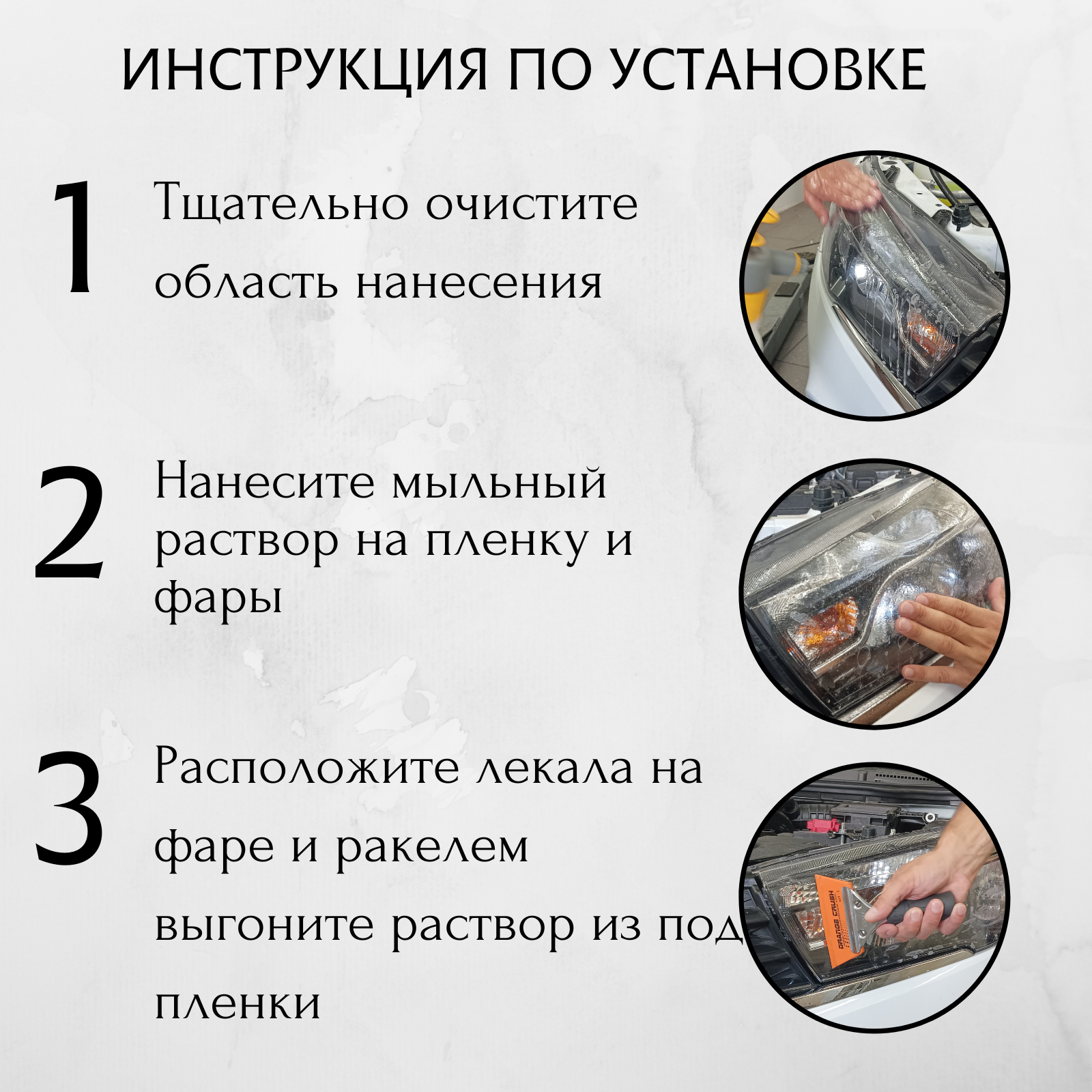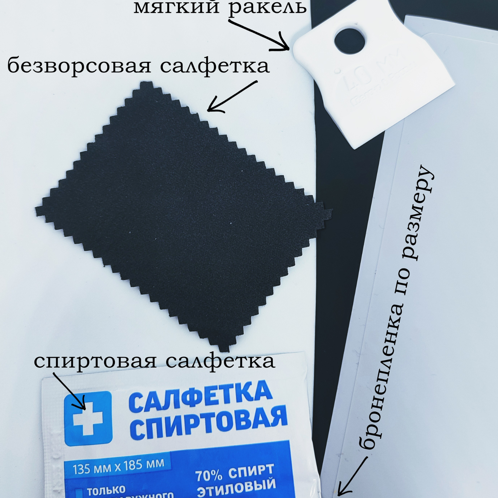| Подробная комплектация | пленка, вырезанная по лекалам; мягкий ракель; безворсовая салфетка; спиртовая салфетка+ подарок |