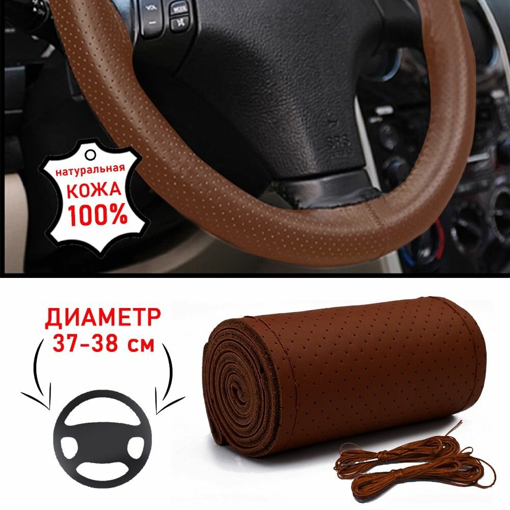 Универсальная оплетка 37 см из натуральной перфорированной кожи на руль со шнуровкой. Коричневая с нитью.