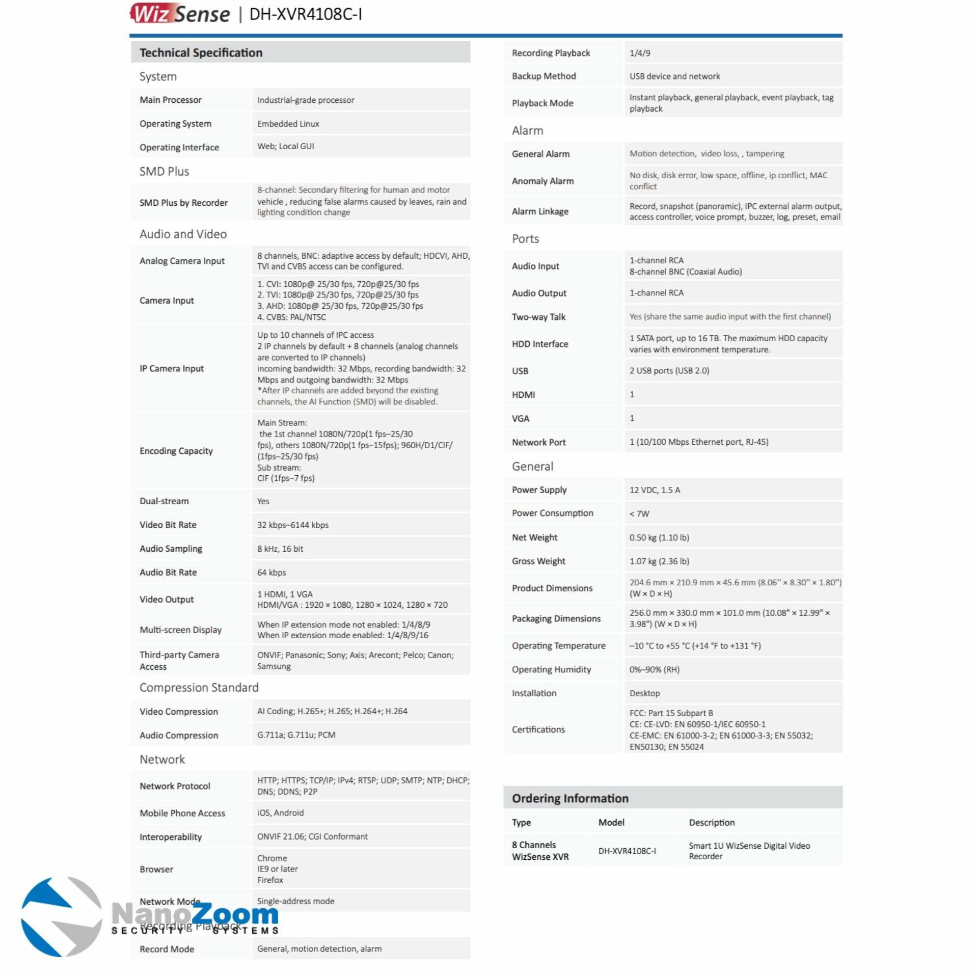 Dahua DH-XVR4108C-I - 8 канальный видеорегистратор для видеонаблюдения HDCVI, XVR-регистратор гибридный 1080N/720p Smart 1U 1HDD WizSense DVR SMD Plus H.265+/H.265 поддержка HDCVI, AHD, TVI, CVBS, IP