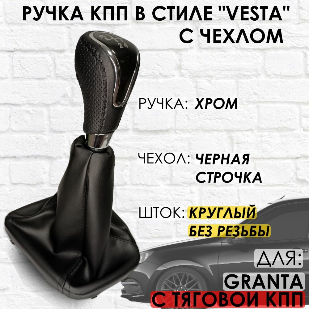Купить Кожаная Ручка КПП с чехлом Granta С кулисой до 2013 г. в. "Веста стиль" (Хром/черная строчка)