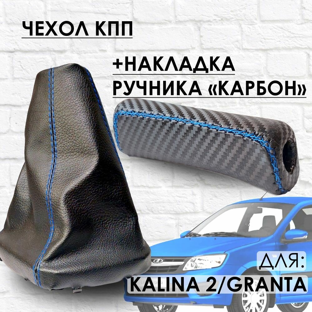 Купить Чехол КПП и Накладка ручника "Карбон" Гранта, Калина 2, Датсун, синяя строчка