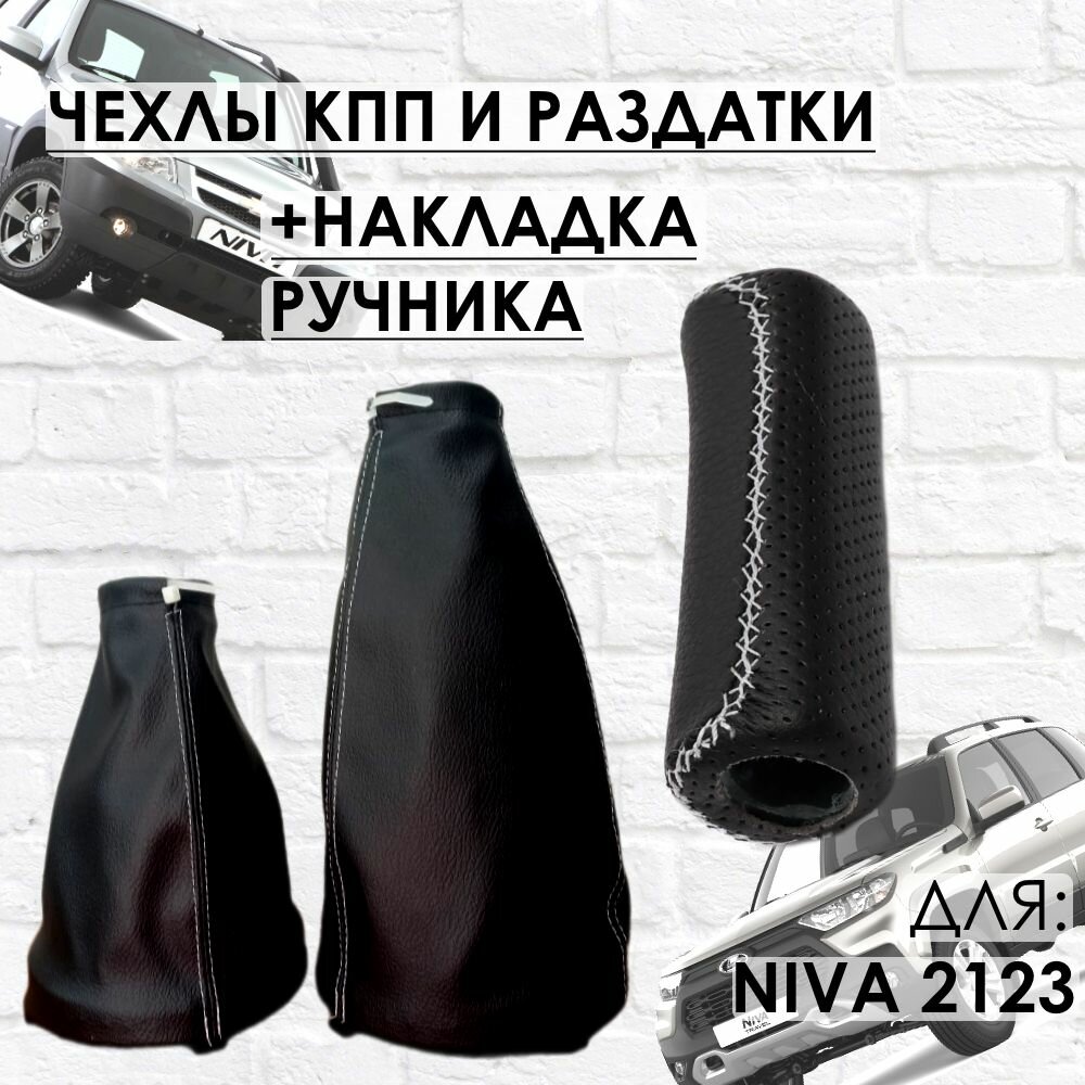 Купить Чехлы на КПП, Раздатку, Накладка на Ручник, Шевроле Нива/Нива Тревел, белая строчка
