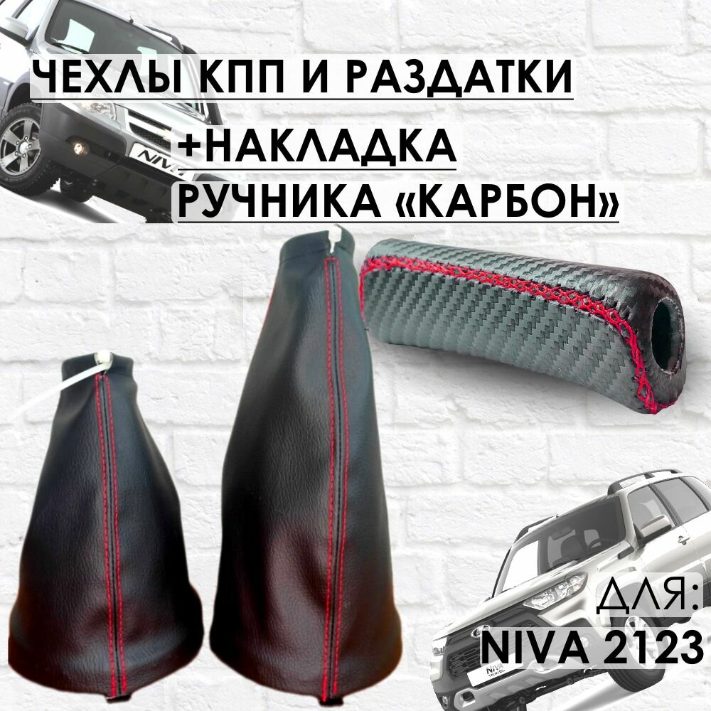 Купить Чехлы на КПП, раздатку и Накладка ручника "Карбон", Шевроле Нива, Нива Тревел, красная строчка