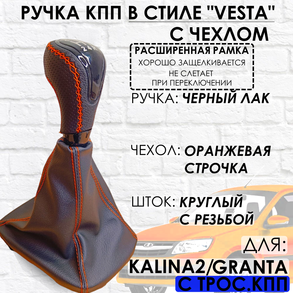 Кожаная Ручка КПП Granta/Kalina 2/Datsun, c 2013г. в, "Веста стиль", (Черный лак/оранжевая строчка), РАСШИРЕННАЯ РАМКА интересное:
