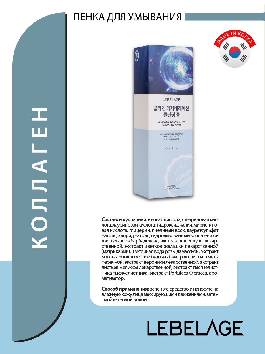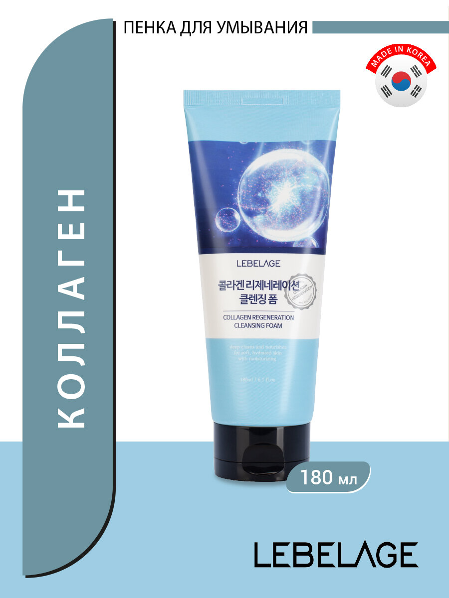 Lebelage Пенка для умывания, для снятия остатков макияжа, для ухода за кожей лица, шеи и зоны декольте очищающая с коллагеном, корейская косметика. 180 мл