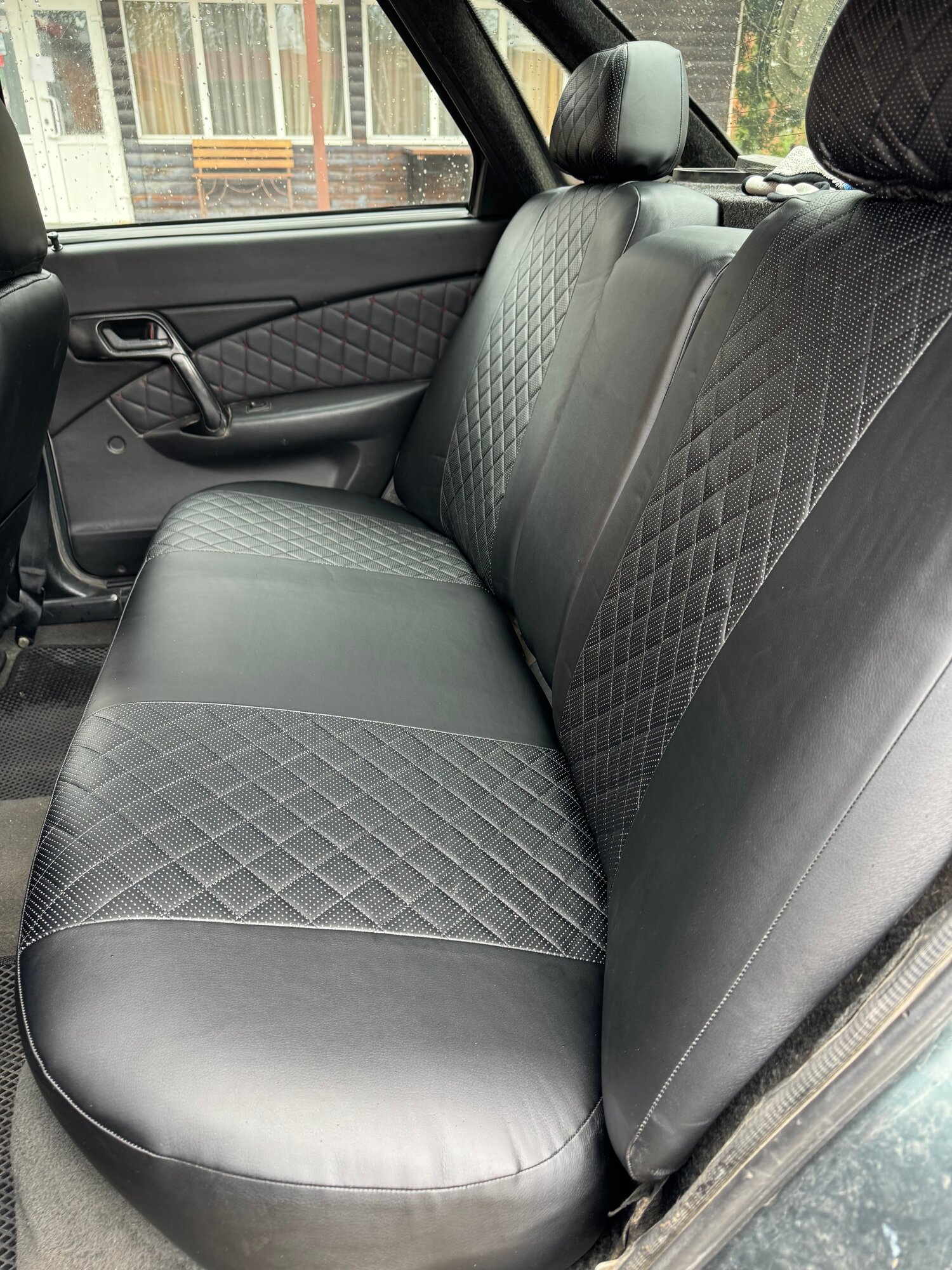 Комплект чехлов "Лайт" для Lada Priora 1 Sd/2110 до рестайлинга с 1996 до 2014 г. Экокожа ромб черный + красная строчка.