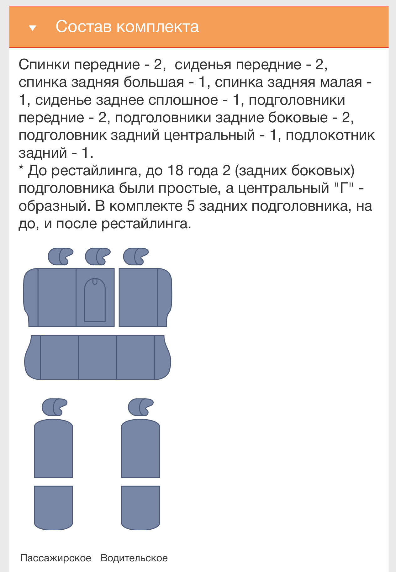 | Дополнительная информация | До рестайлинга, до 18 года 2 (задних боковых) подголовника были простые, а центральный "Г" - образный. В комплекте 5 задних подголовника, на до, и после рестайлинга. |