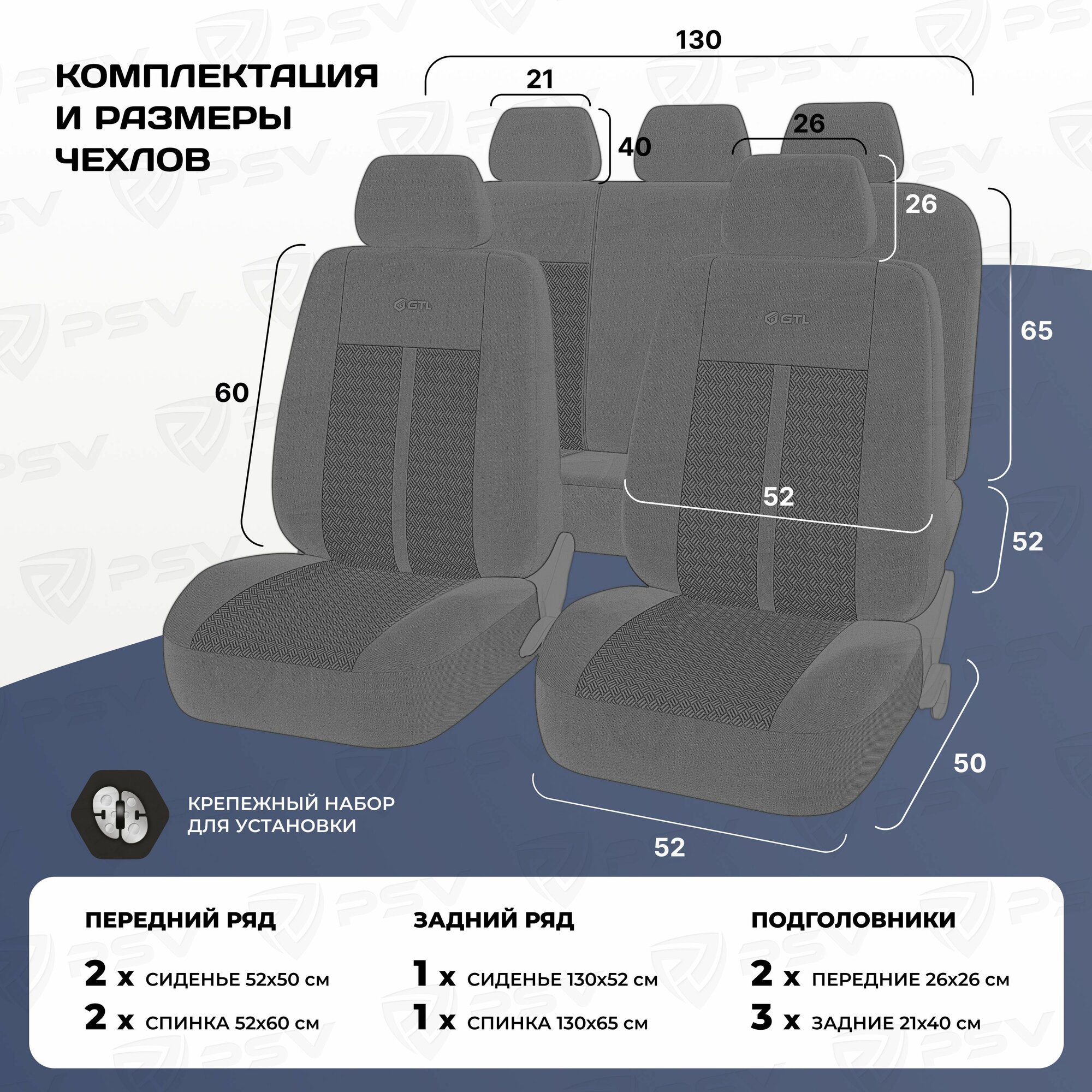 | Подробная комплектация | 2 передних чехла 2 подголовника Крепежный набор для установки |