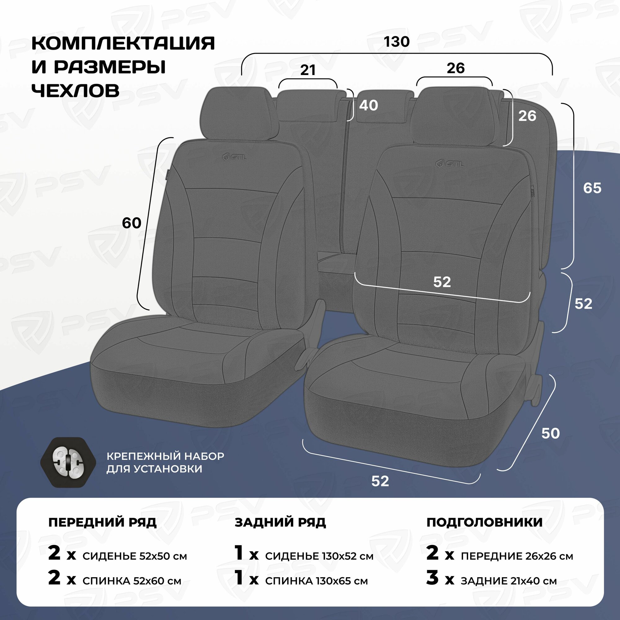| Подробная комплектация | 2 передних чехла 2 подголовника Крепежный набор для установки |