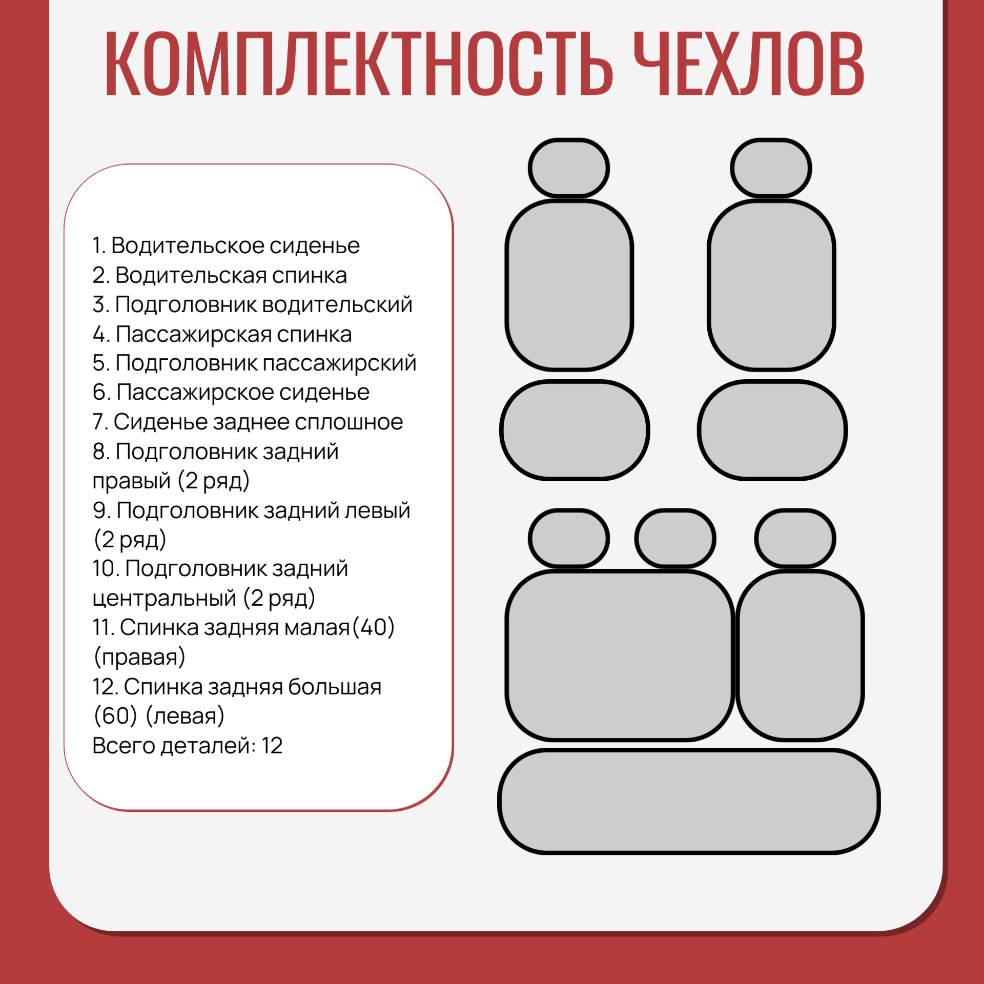 | Подробная комплектация | В комплект чехлов входят: 1. Передняя спинка - 2 шт.; 2. Переднее сиденье -2 шт.; 3. Задняя спинка - 2 шт. (разделение 60/40); 4. Заднее сиденье - 1 шт.; 5. Подголовники 5 шт.; |