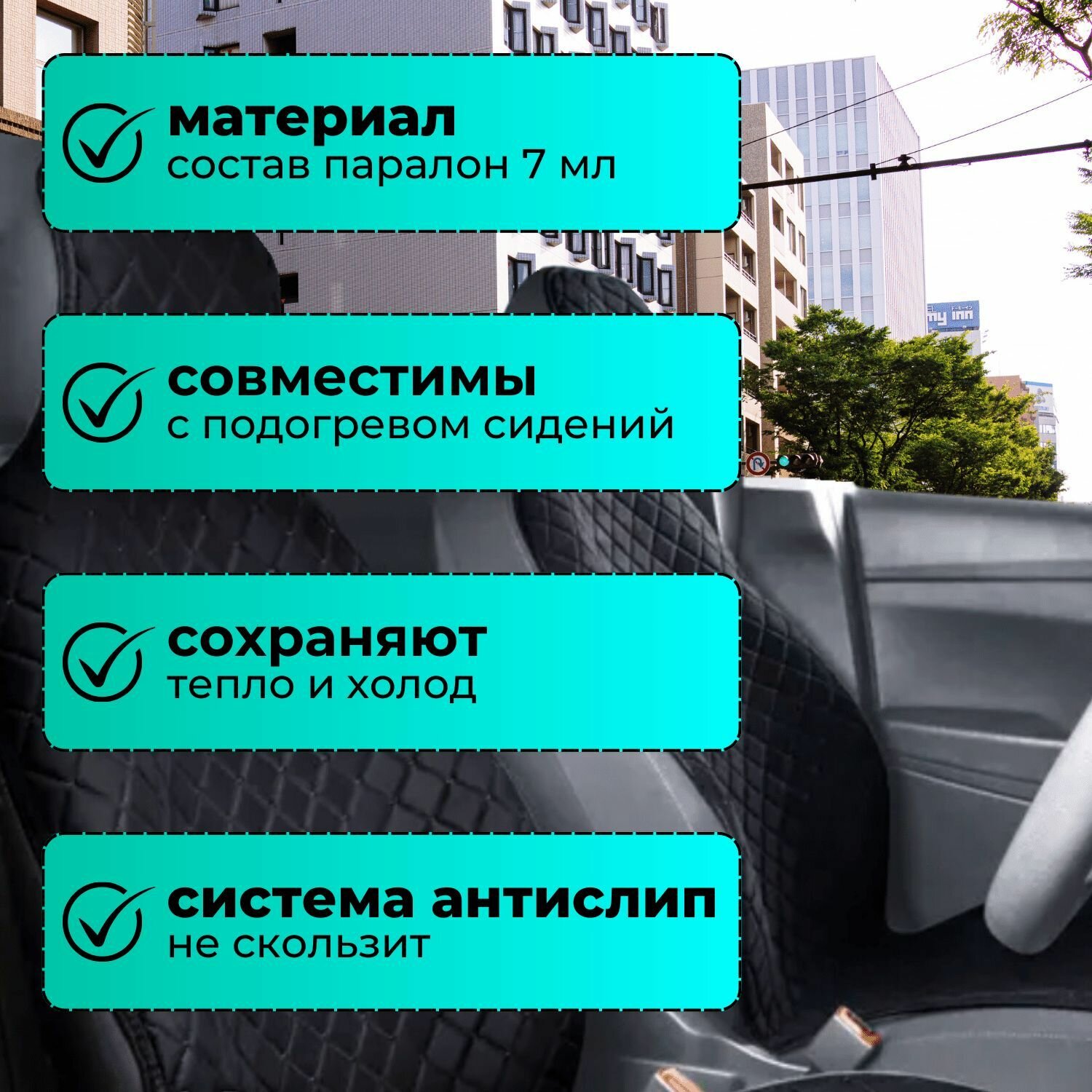 | Особенности | износоустойчивая ткань / можно стирать в стиральной машине / нескользящее покрытие / Использование с боковыми airbag / Крепеж / Петли для крепления / Фиксирующие резинки |