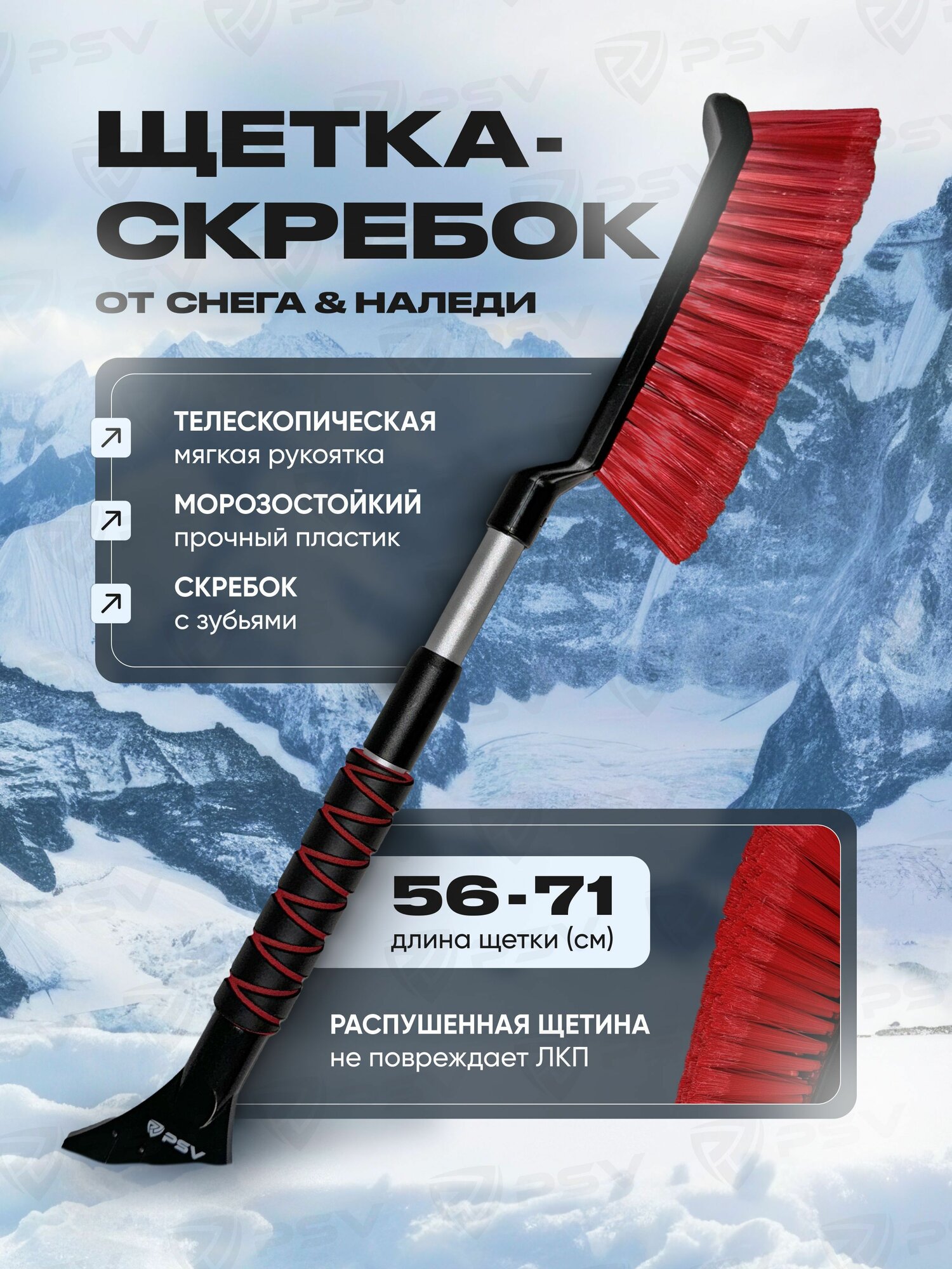 Купить Щетка автомобильная для снега со скребком PSV Zima 56-71 с мягкой ручкой и распушенной щетиной телескопическая
