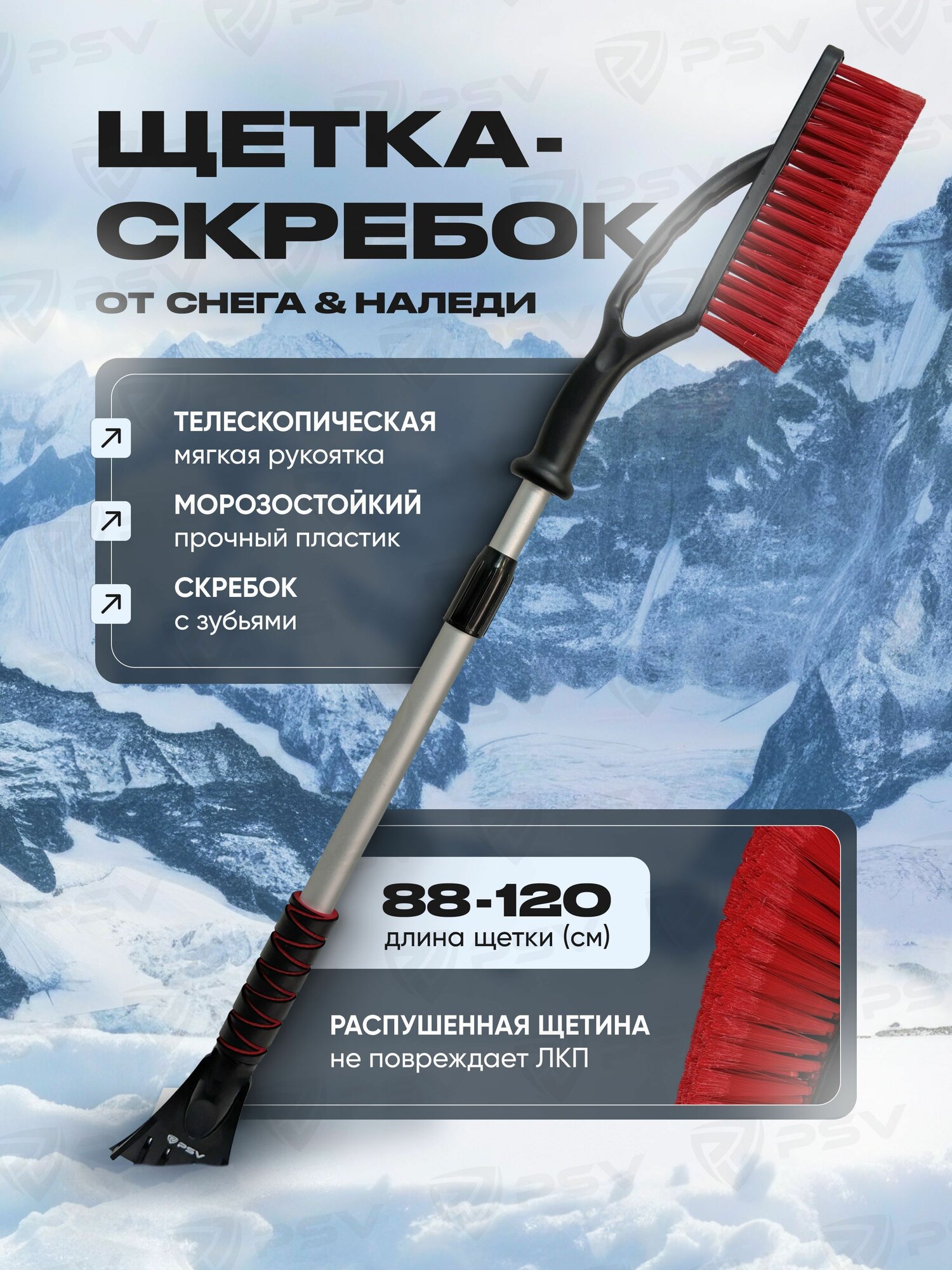 Купить Щетка автомобильная для снега со скребком PSV Zima 88-120 с мягкой ручкой и распушенной щетиной телескопическая
