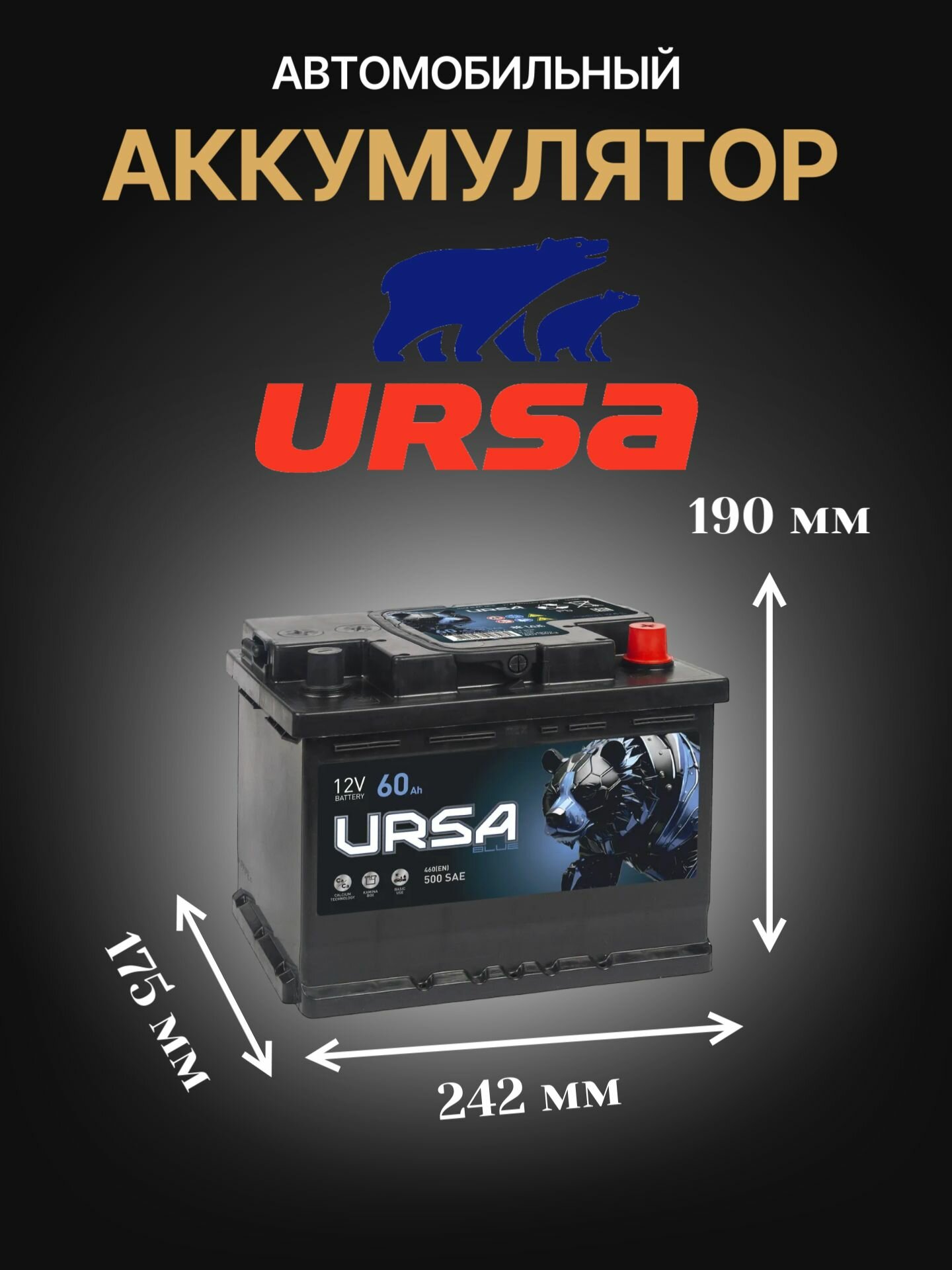 Автомобильный Аккумулятор URSA Blue 60Ah прям. пол. 500А 242x175x190