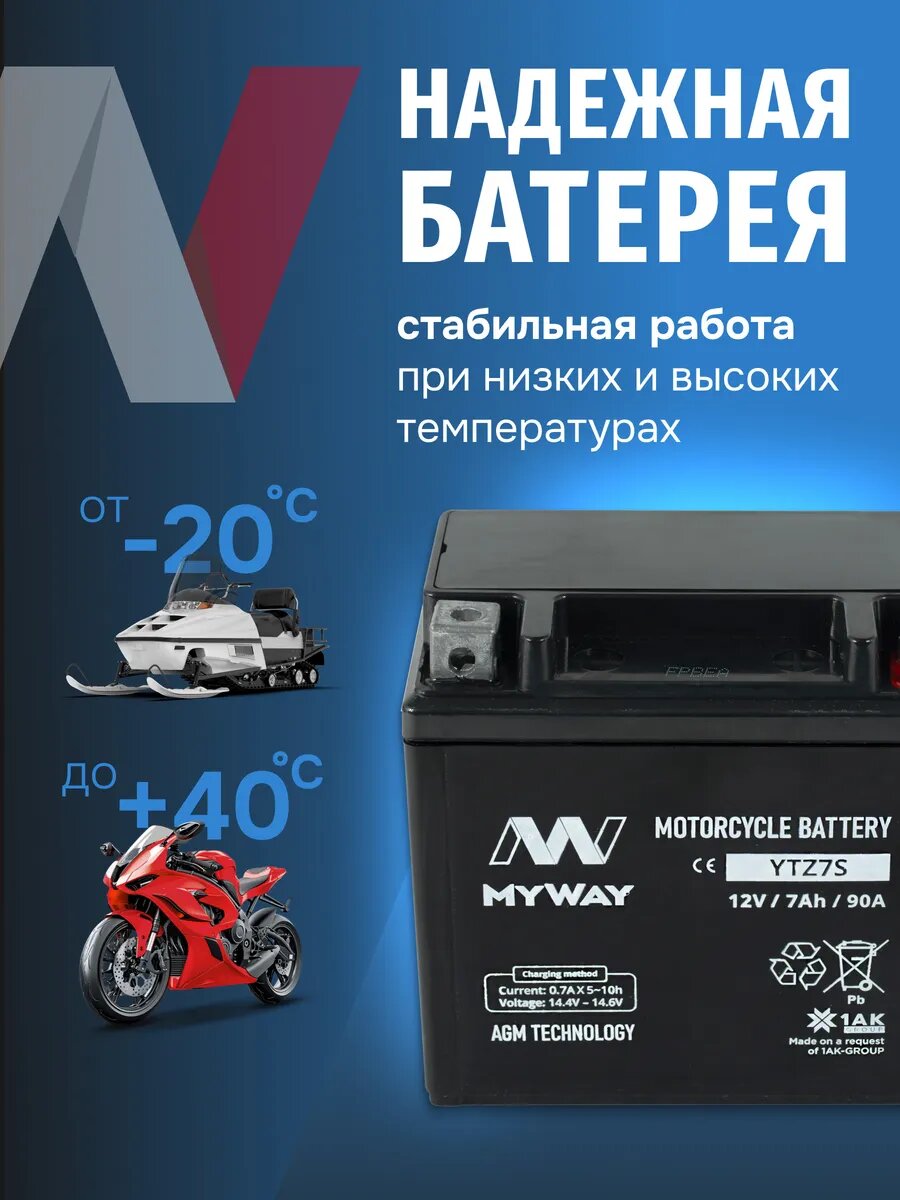 Аккумулятор для мотоцикла 12v 7ah AGM на скутер, мопед