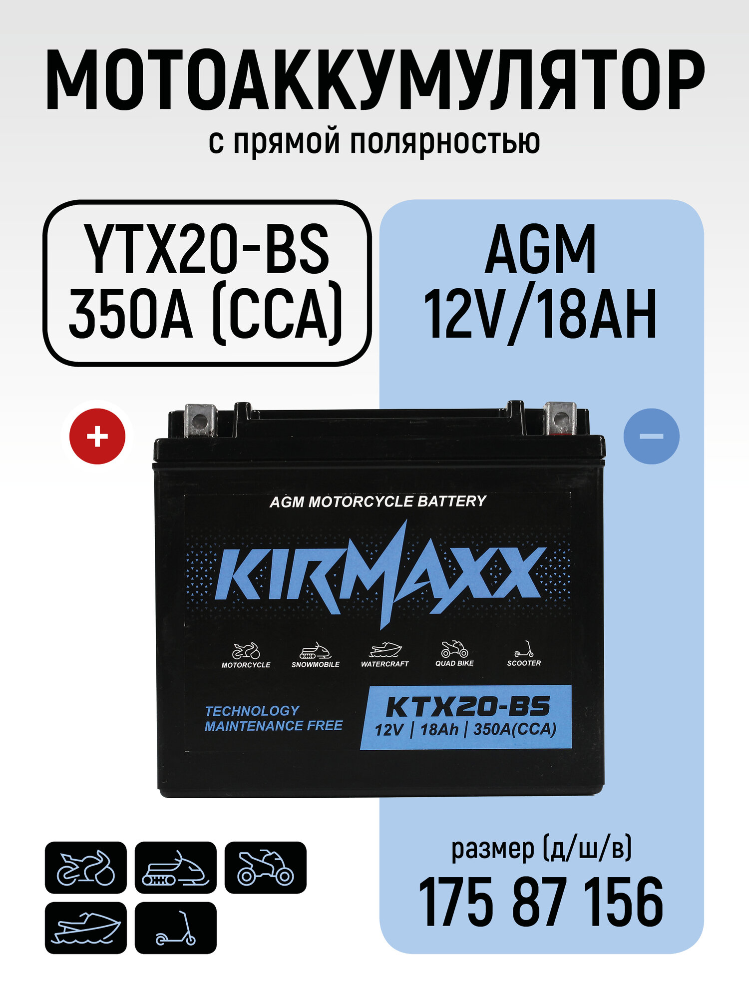 Мото аккумулятор KIRMAXX AGM 12В 18 Ач (YTX20-BS, СТ1218) стартерный для мотоцикла, квадроцикла, скутера 12V 18 Ah интересное: