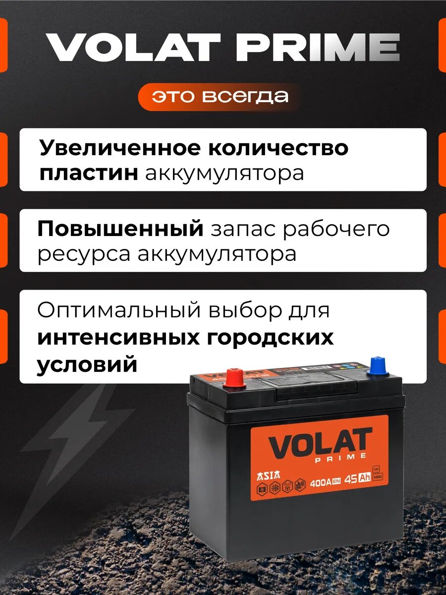 Аккумулятор автомобильный VOLAT Prime Asia (без борта) 45 Ah 400 A обратная полярность 237x127x225