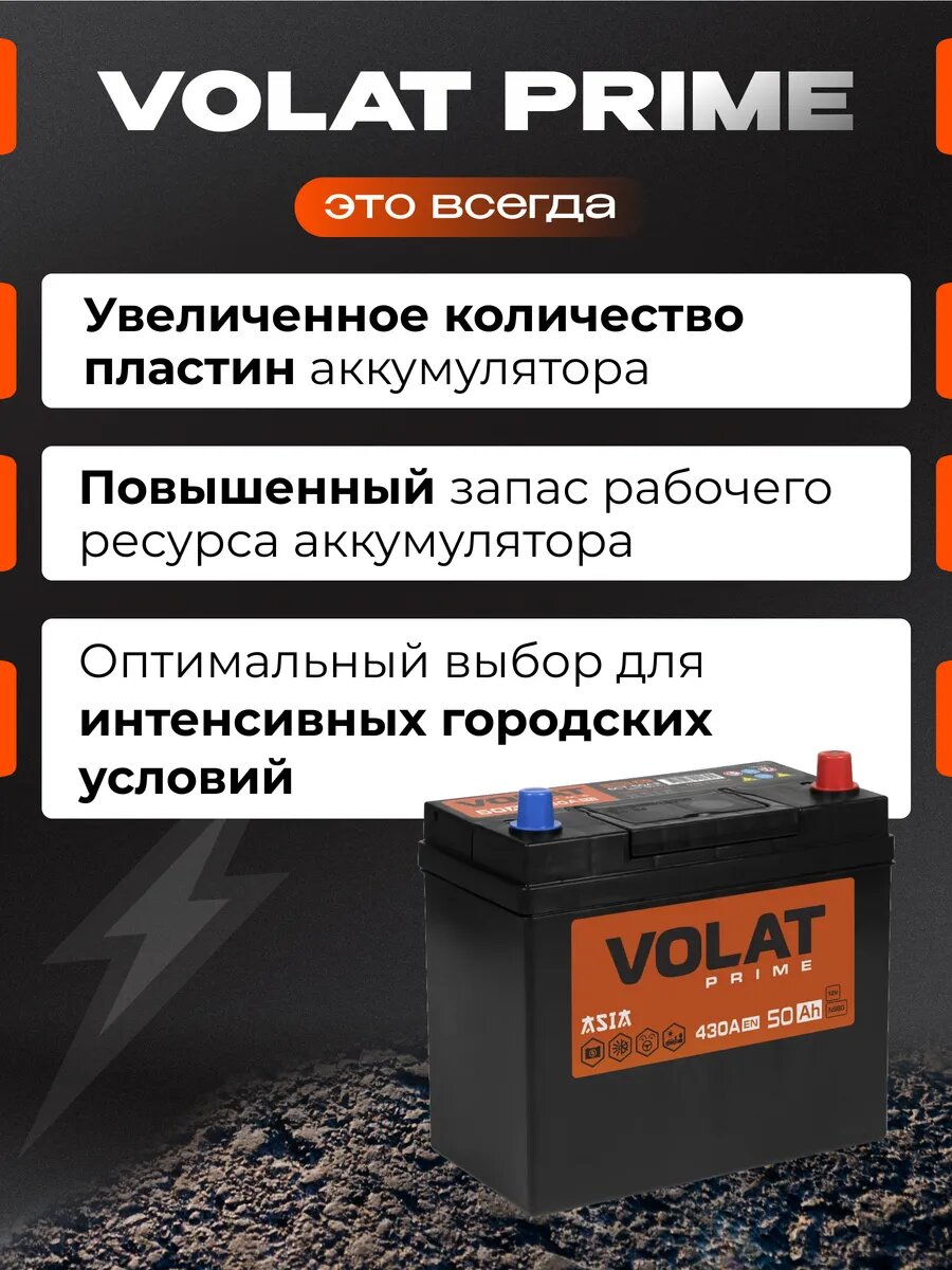 Аккумулятор автомобильный VOLAT Prime Asia (без борта) 50 Ah 430 A прямая полярность 237x127x225