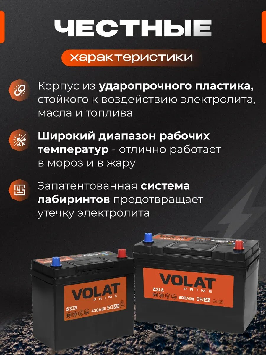 Аккумулятор автомобильный VOLAT Prime Asia (без борта) 50 Ah 430 A прямая полярность 237x127x225