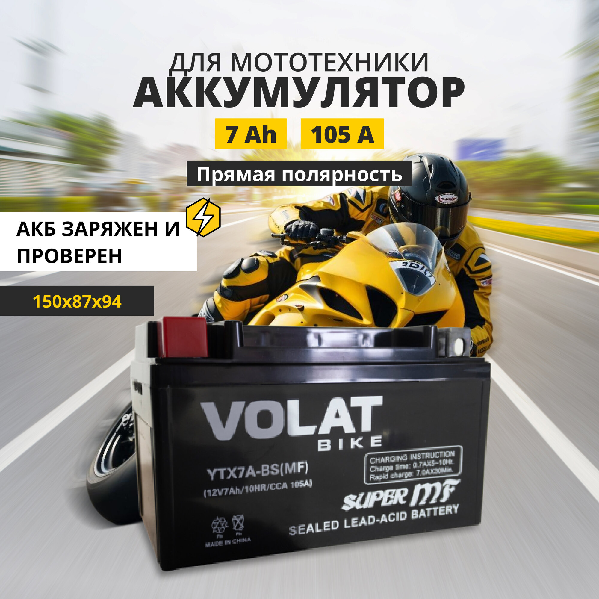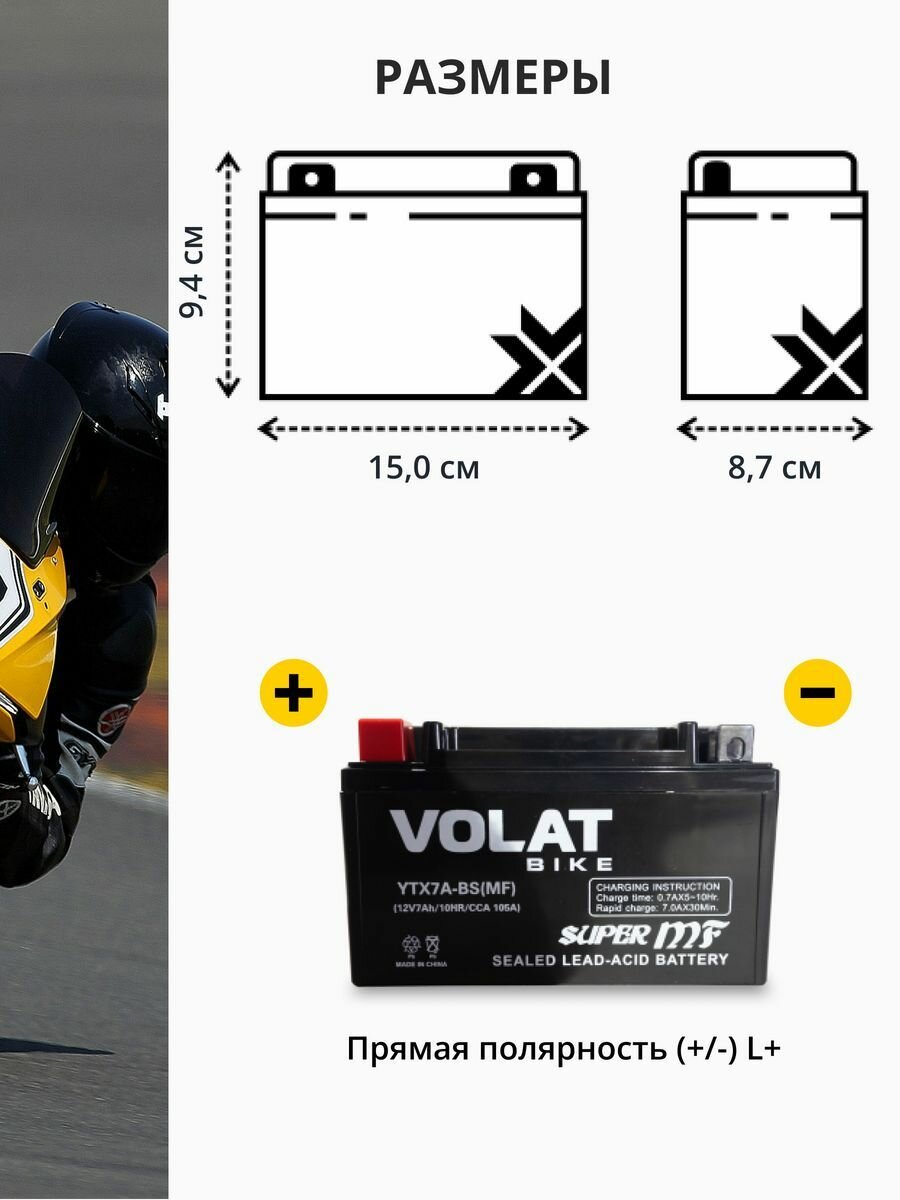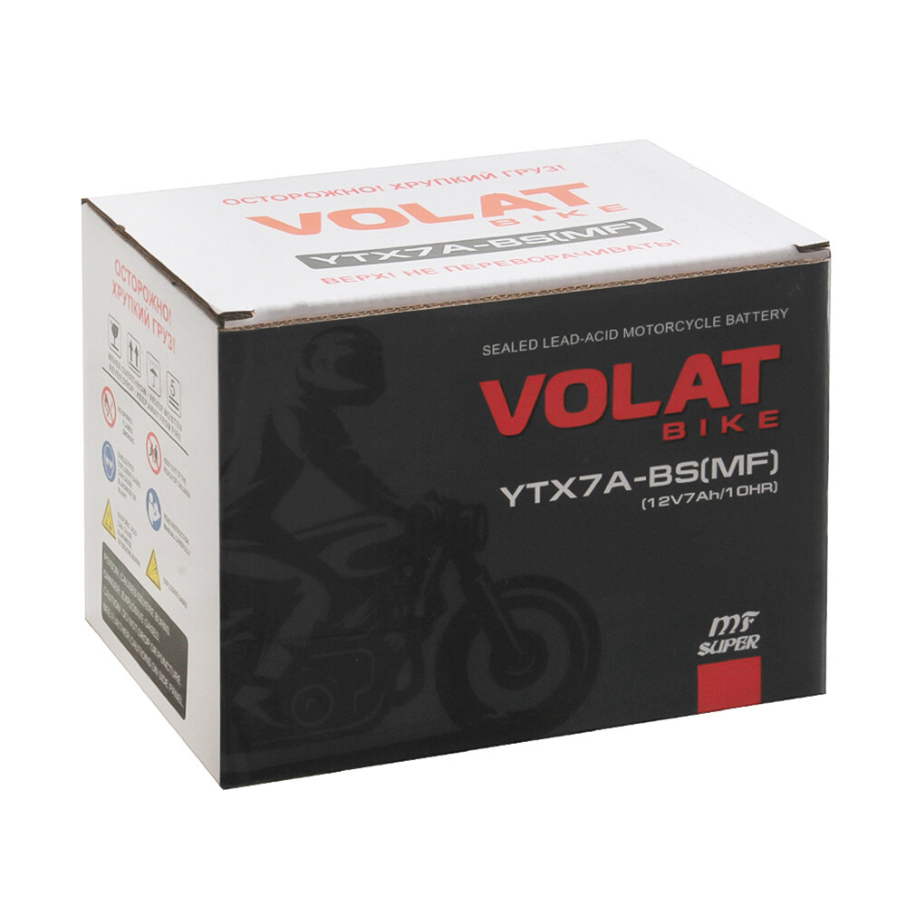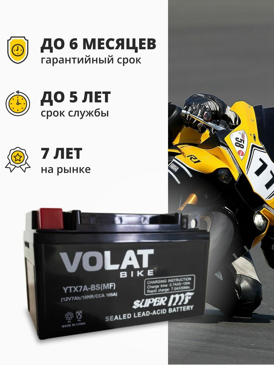 Аккумулятор для мотоцикла 12v Volat YTX7A-BS(MF) прямая полярность 7 Ah 105 A AGM, акб на скутер, мопед, квадроцикл, мотоцикл