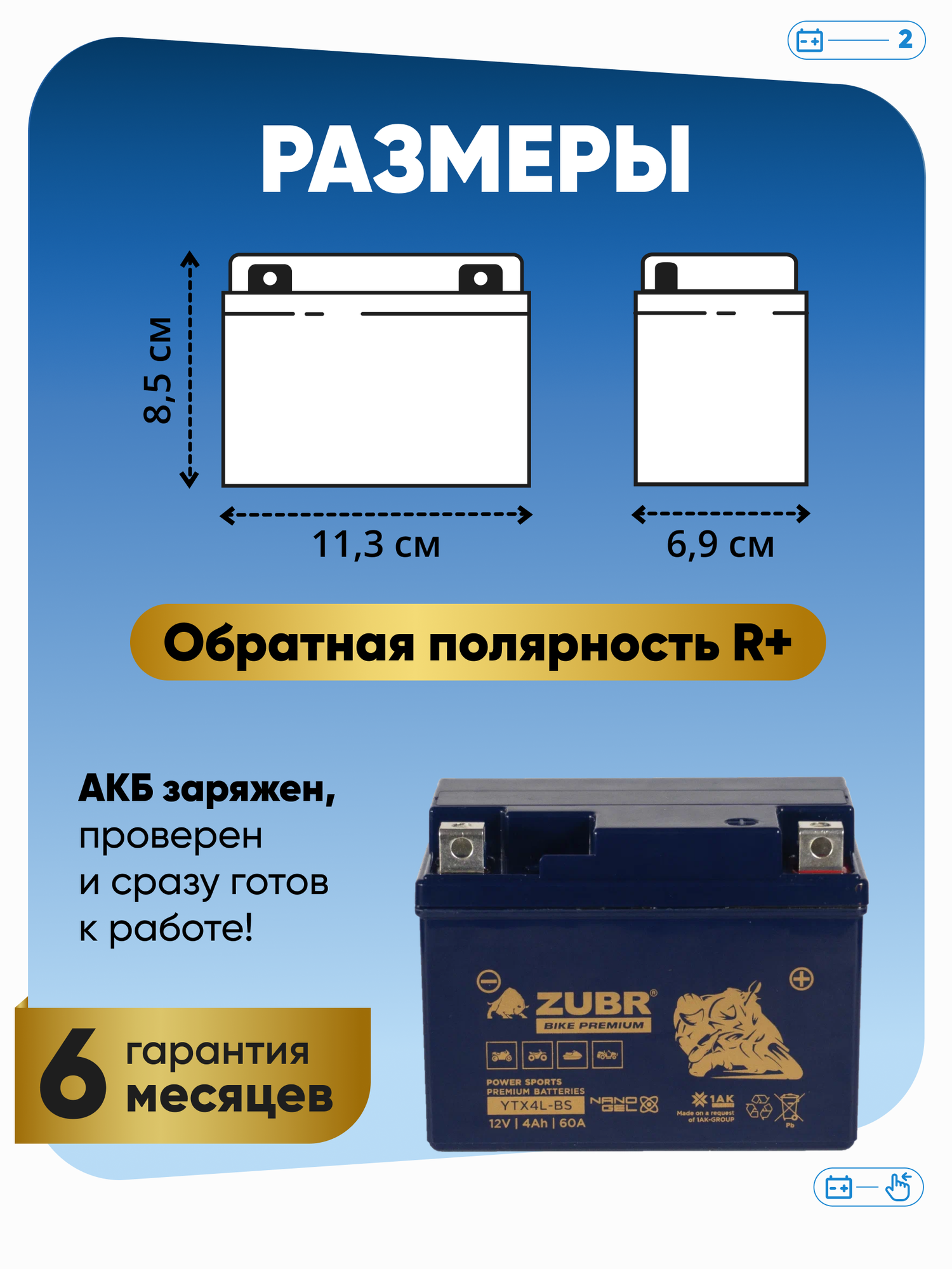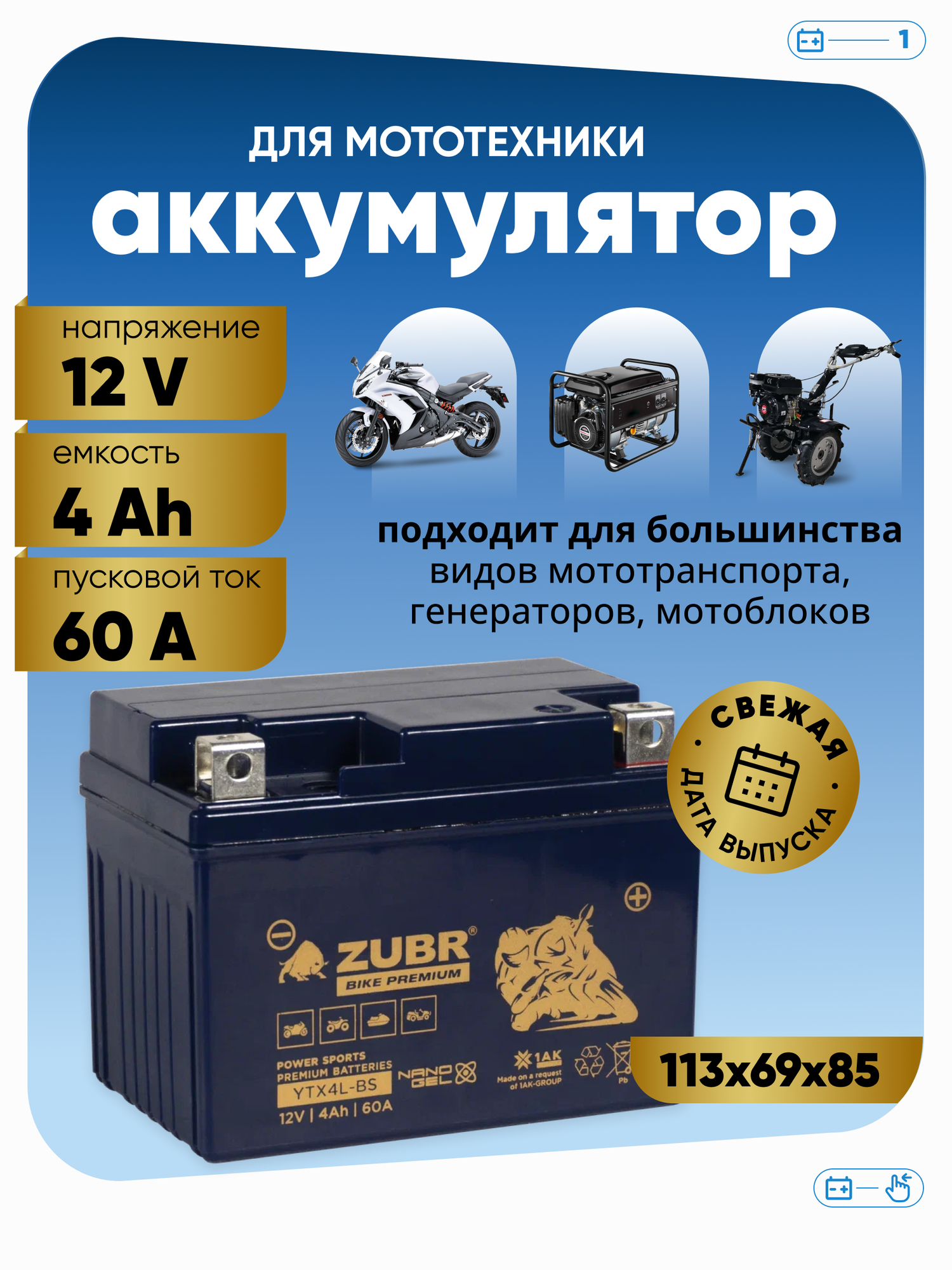 СохранитьАккумулятор для мотоцикла 12v ZUBR BIKE PREMIUM YTX4L-BS (NANO-GEL) обратная полярность 4 Ah 60 A гелевый, акб на скутер, мопед, квадроцикл, мотоцикл интересное: