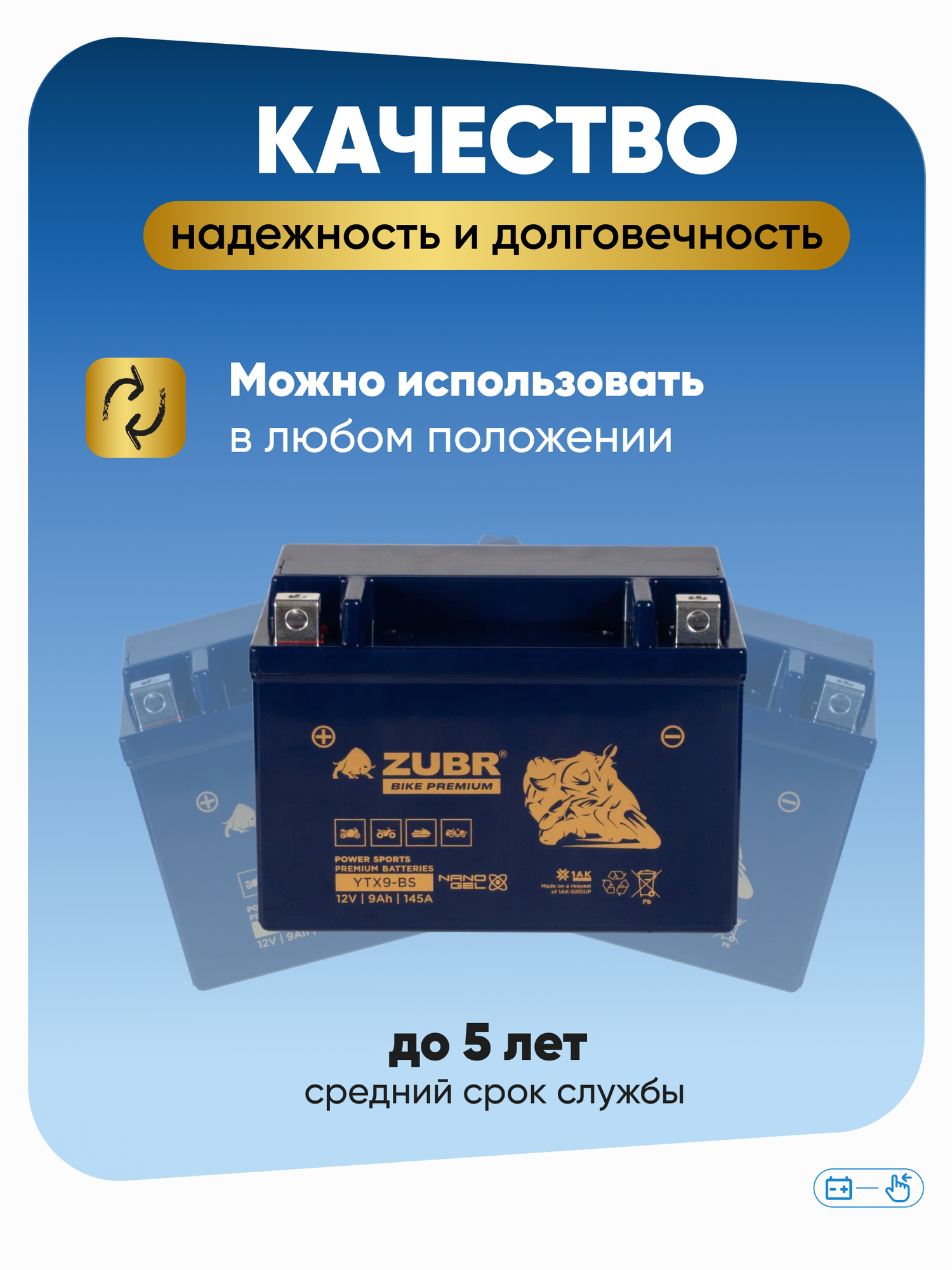 СохранитьАккумулятор для мотоцикла 12v ZUBR BIKE PREMIUM YTX9-BS (NANO-GEL) прямая полярность 9 Ah 145 A гелевый, акб на скутер, мопед, квадроцикл, мотоцикл интересное: