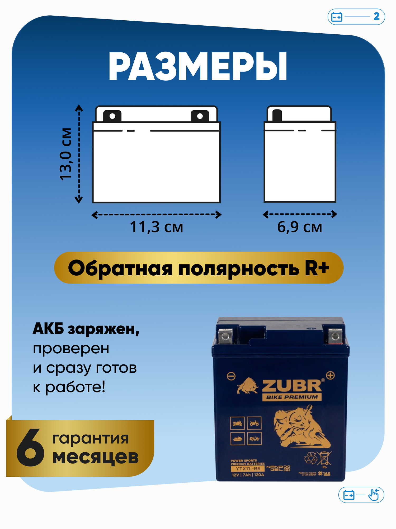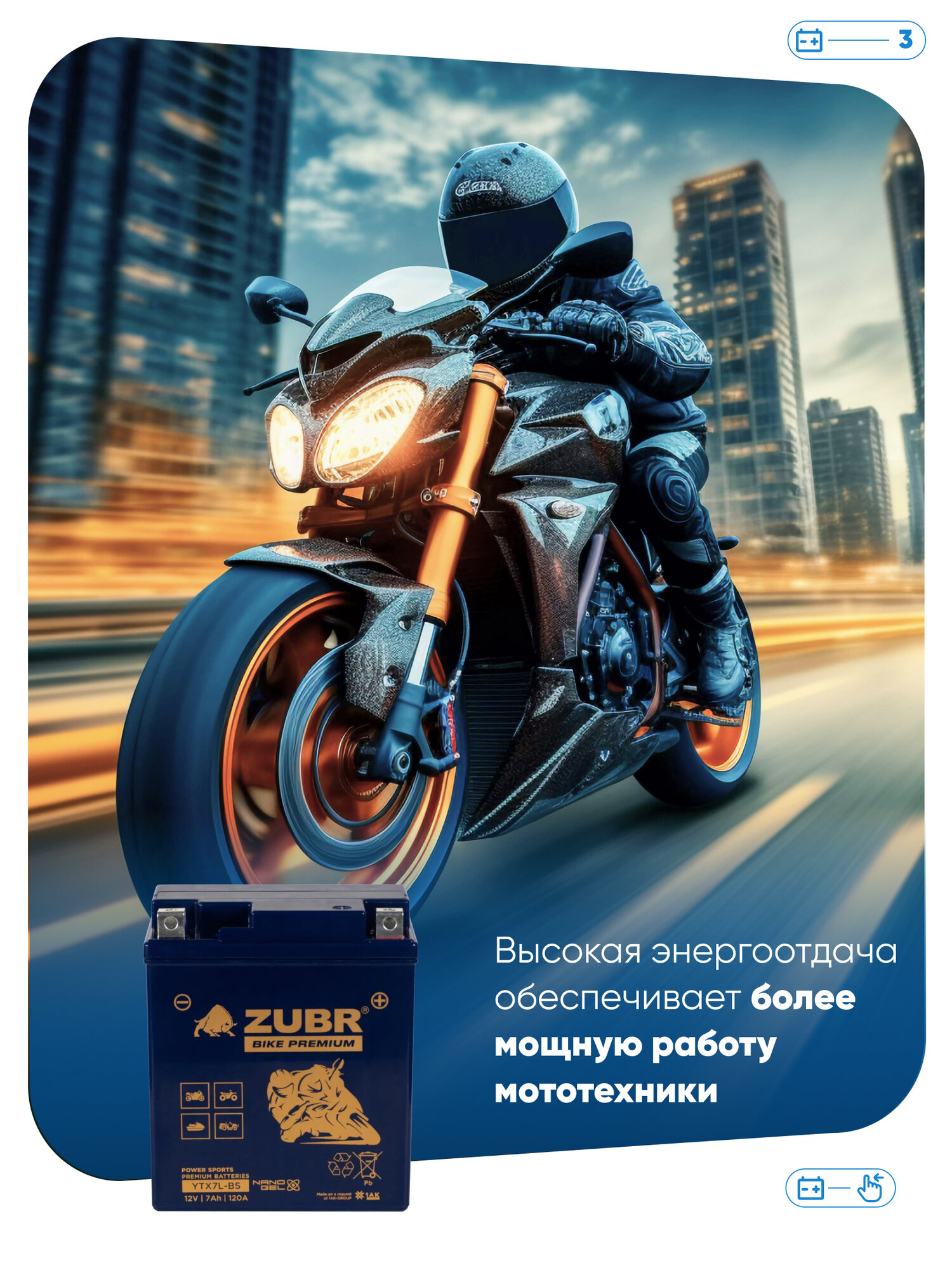 СохранитьАккумулятор для мотоцикла 12v ZUBR BIKE PREMIUM YTX7L-BS (NANO-GEL) обратная полярность 7 Ah 120 A гелевый, акб на скутер, мопед, квадроцикл, мотоцикл интересное: