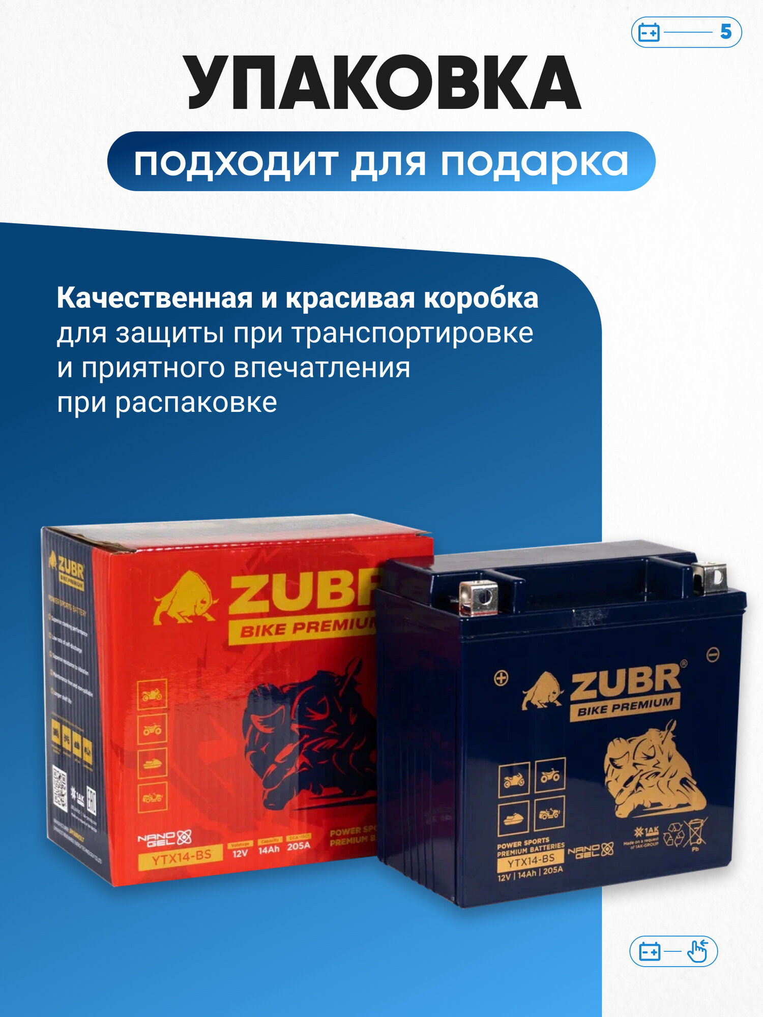 СохранитьАккумулятор для мотоцикла 12v ZUBR BIKE PREMIUM YTX14-BS (NANO-GEL) прямая полярность 14 Ah 205 A гелевый, акб на скутер, мопед, квадроцикл, мотоцикл интересное: