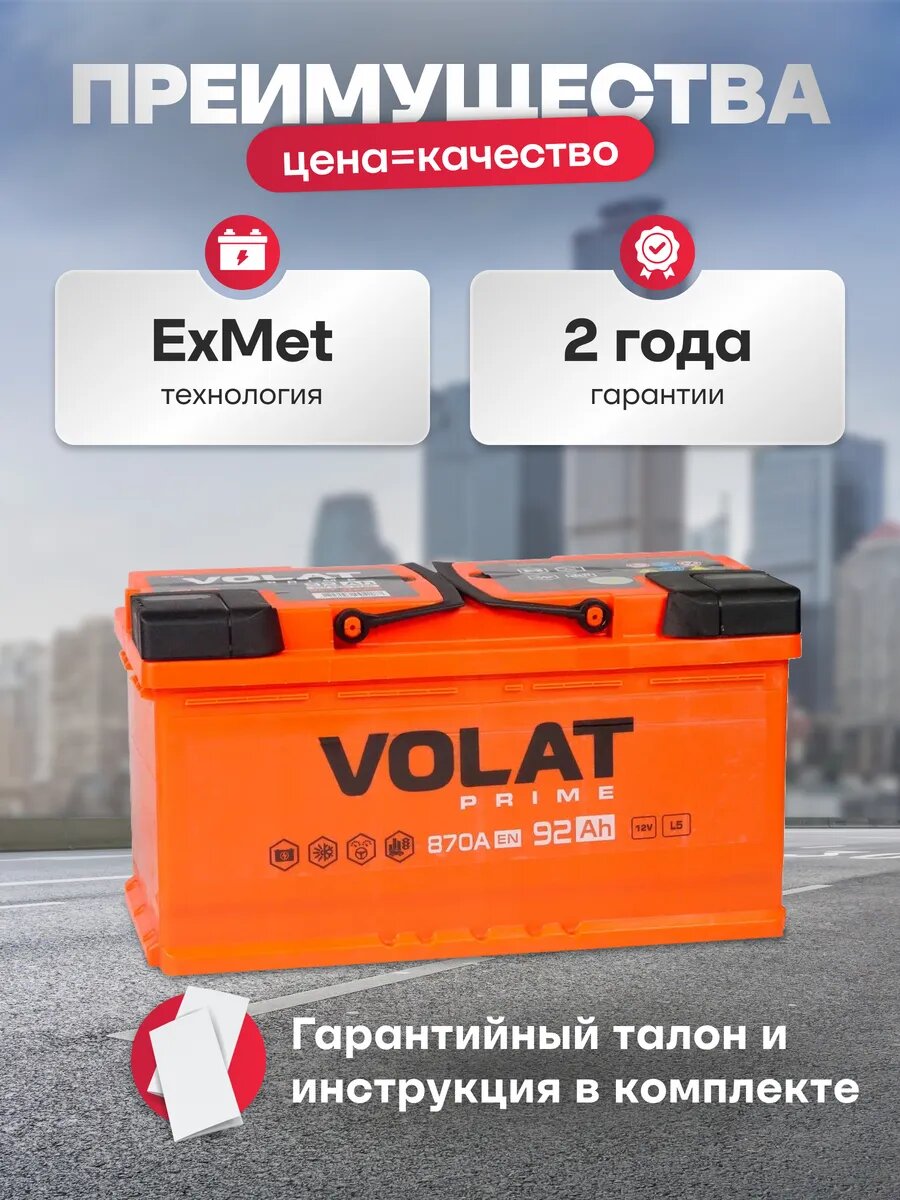 Аккумулятор автомобильный VOLAT Prime 90 Ah 870 A обратная полярность 353x175x190