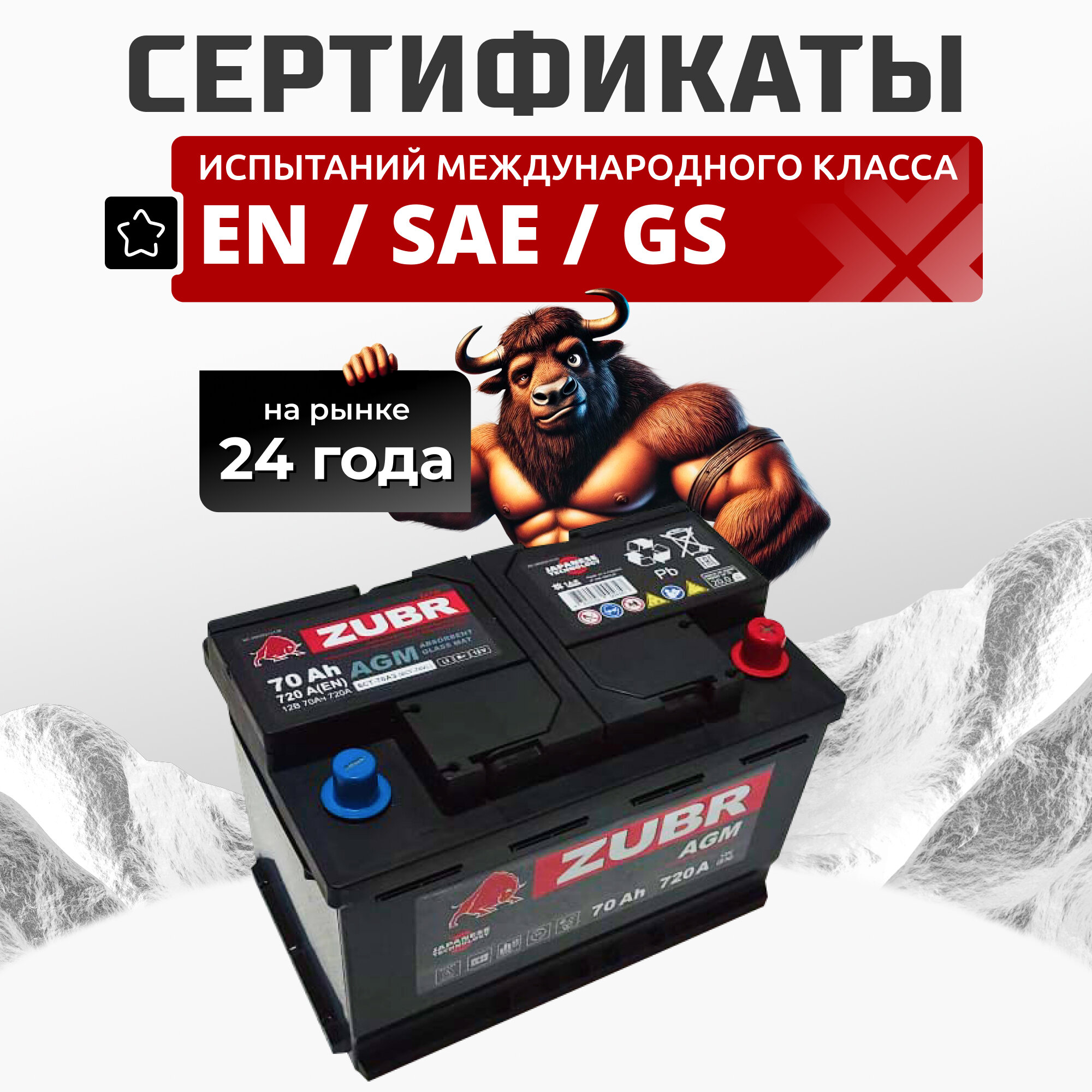 Аккумулятор автомобильный ZUBR AGM 70 Ач 720А обратная полярность