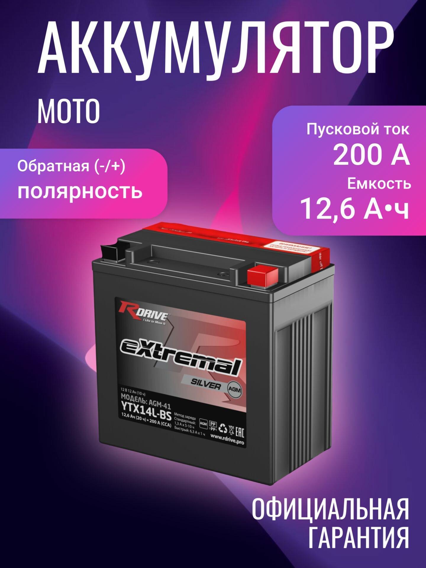 Купить Аккумулятор для мототехники RDRIVE eXtremal Silver 12В 12,6Ач 200А