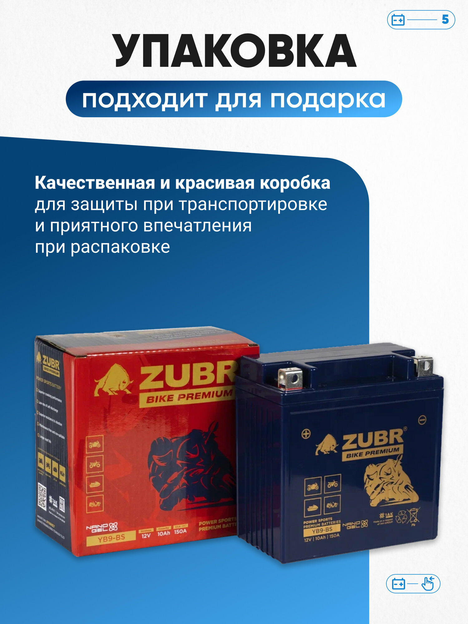 Аккумулятор для мотоцикла 12v ZUBR BIKE PREMIUM YB9-BS (NANO-GEL) прямая полярность 10 Ah 150 A гелевый, акб на скутер, мопед, квадроцикл, мотоцикл интересное: