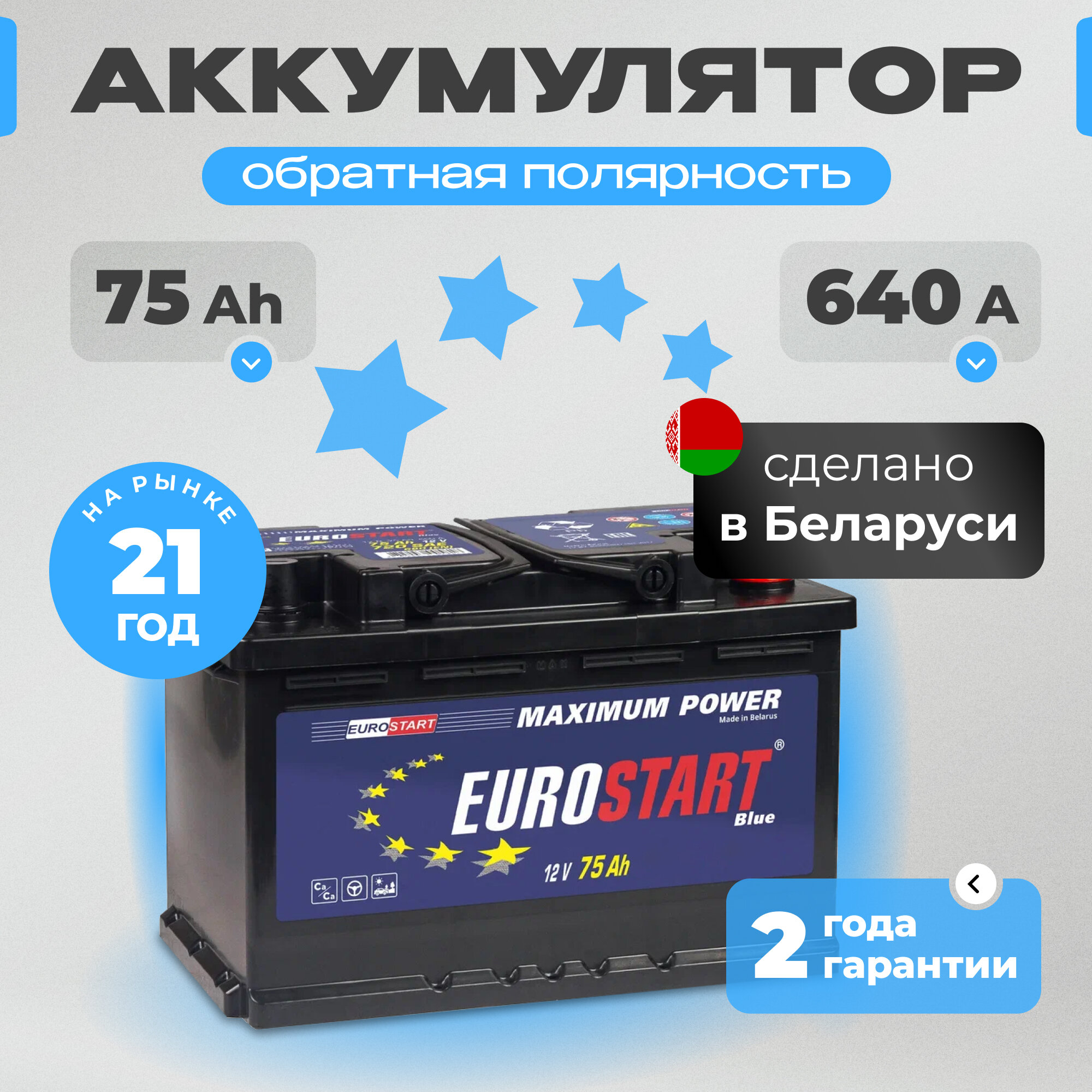 Купить Аккумулятор автомобильный EUROSTART Blue 75 Ач 640 A обратная полярность 278x175x190 мм