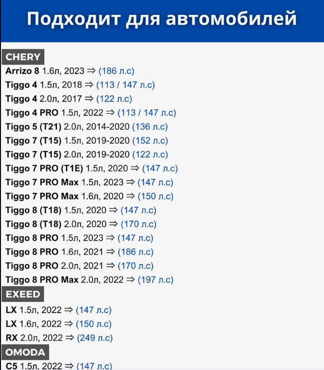 | Модель автомобиля | Chery Arrizo 7 / Chery Arrizo 8 / Chery Tiggo / Chery Tiggo 3 / Chery Tiggo 4 / Chery Tiggo 4 Pro / Chery Tiggo 5 / Chery Tiggo 7 / Chery Tiggo 7 Pro / Chery Tiggo 7 Pro Max / Chery Tiggo 8 / Chery Tiggo 8 Pro / Chery Tiggo 8 Pro Max / CheryExeed TXL / EXEED LX / Jetour Dashing / OMODA C5 / OMODA S5 / C5 / LX / Tiggo 7 Pro / Tiggo 8 Pro |