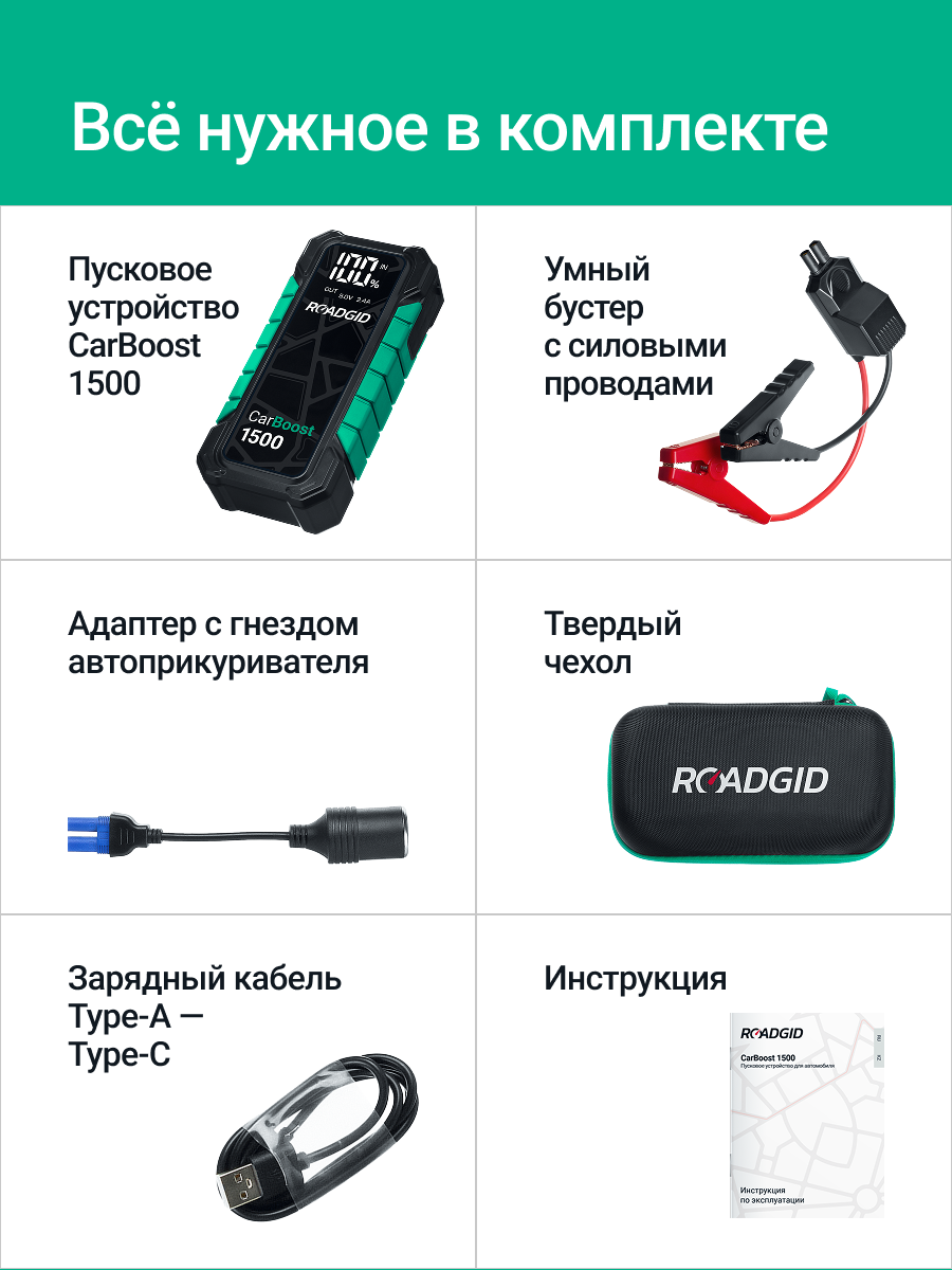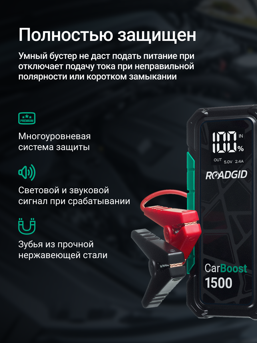 Пусковое устройство для автомобиля Roadgid CarBoost 1500 / бустер автомобильный пусковой / 1500А /12000 мАч /LED фонарь интересное: