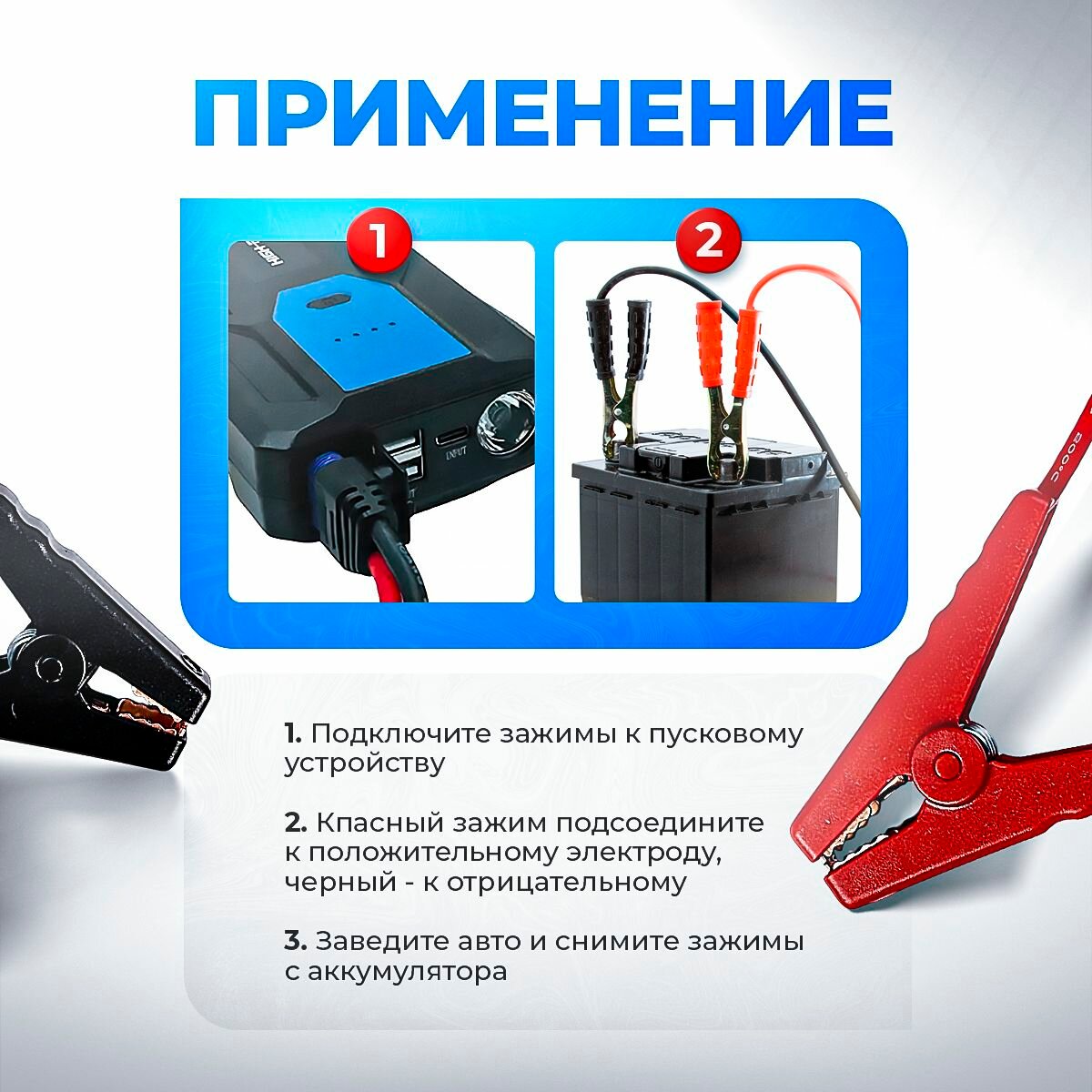 | Комплектация | Пусковое устройство Провода "Крокодилы" Кабель зарядки Кейс |