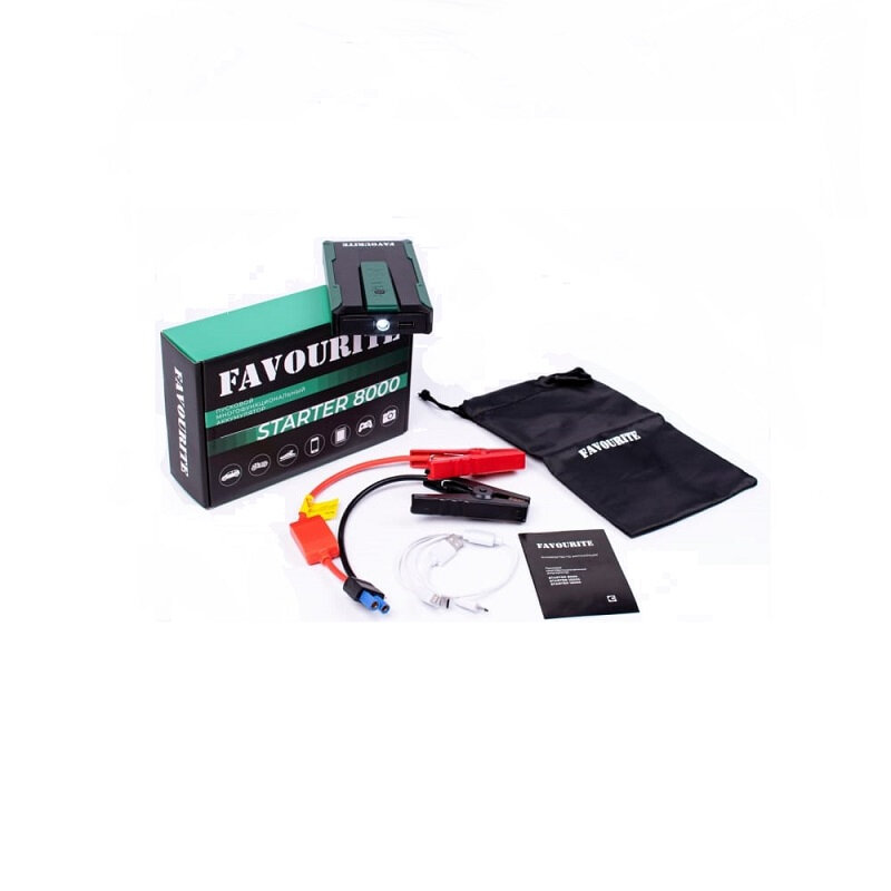 | Комплектация | Пусковой многофункциональный аккумулятор 8000 мАч, 5В/2А, 12В, 300/600 А, Запуск бенз-ых двигателей объемом до 4 л. Запуск дизельных двигателей объемом до 2 л FAVOURITE |