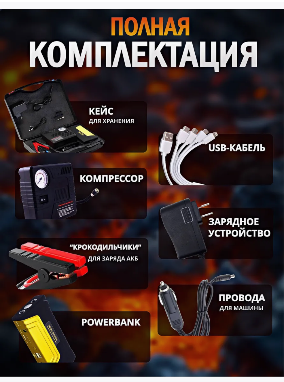 | Комплектация | кейс; повербанк; пусковое устройство; компрессор |