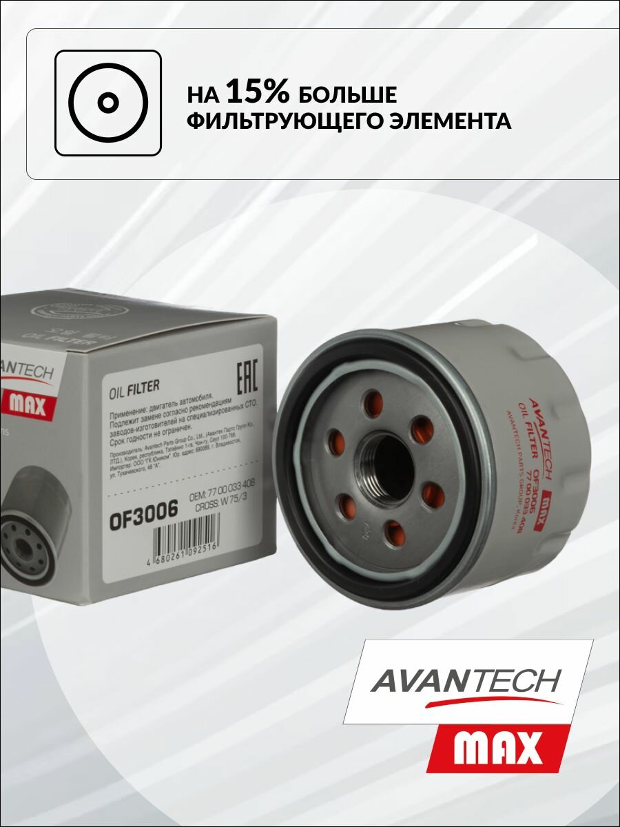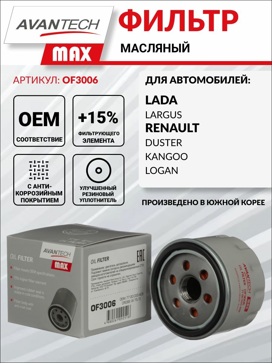 Фильтр масляный Avantech MAX арт. OF3006 для LADA Largus / RENAULT Duster Kangoo Logan интересное: