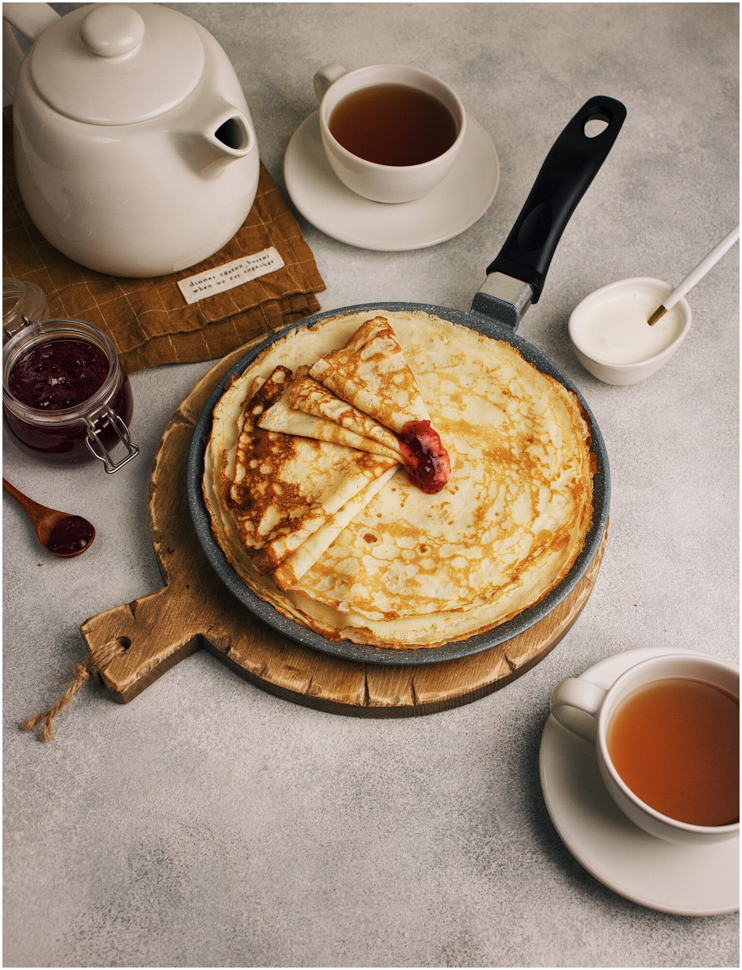 Дно не тонкое, блинчики не обгорают, прогревается равномерно. Рекомендую. На фото плита шириной 50 см. |